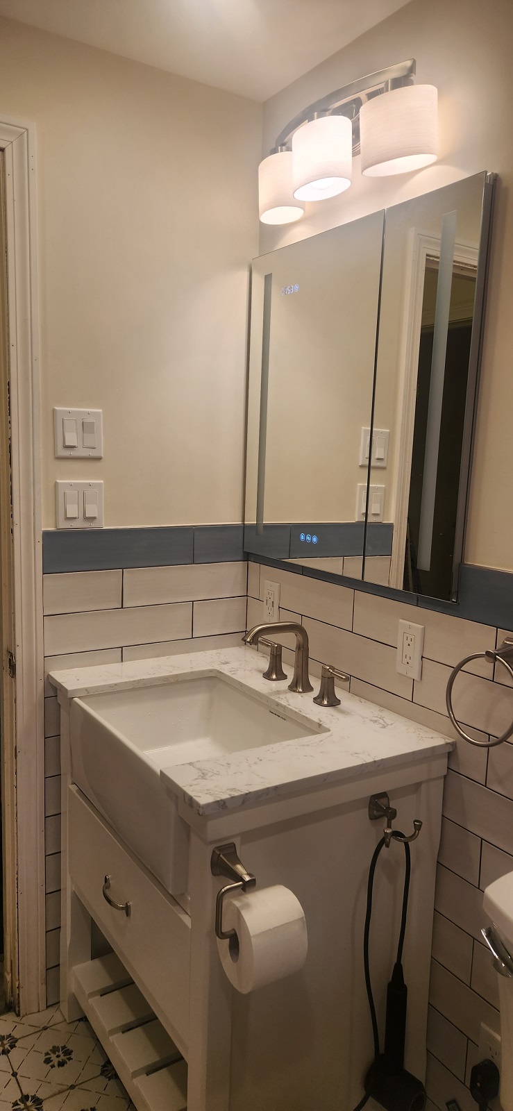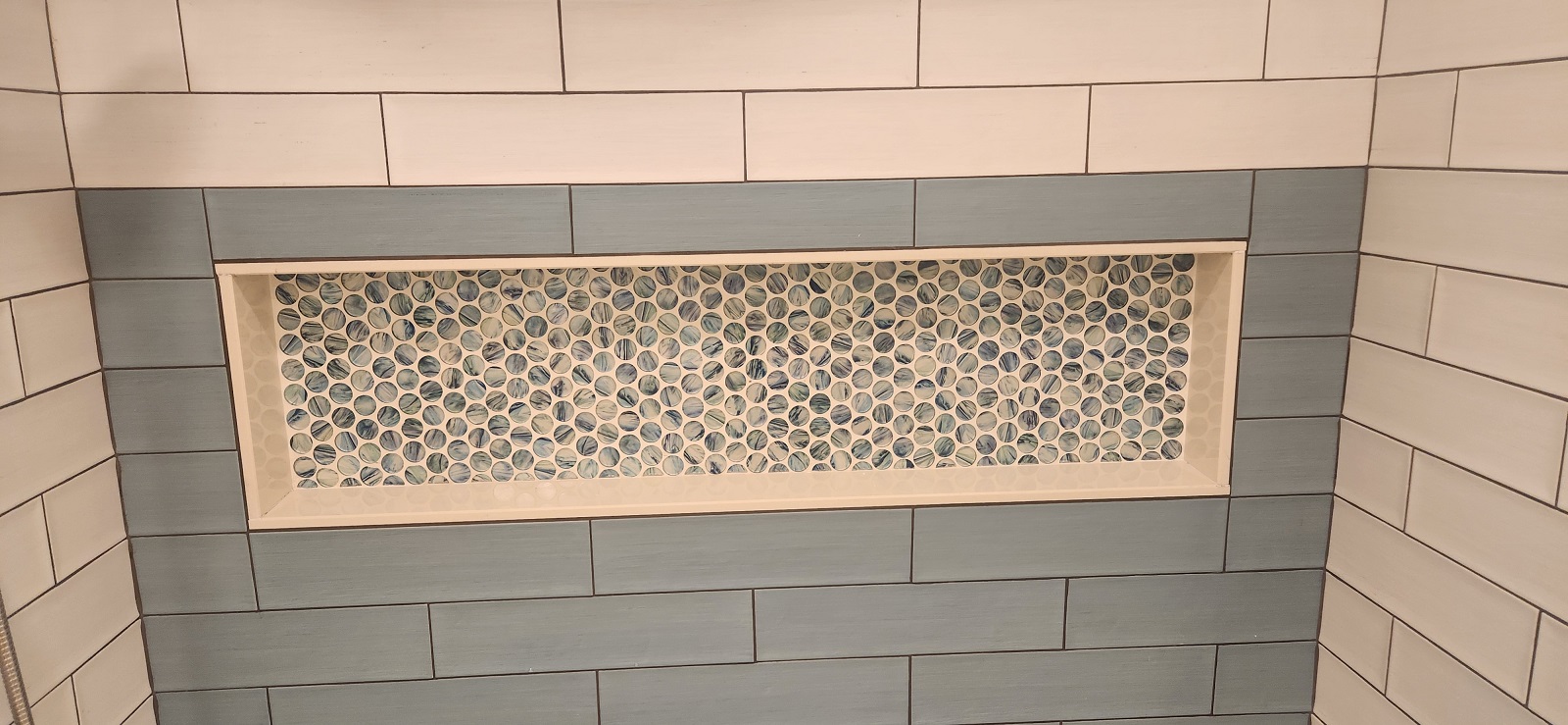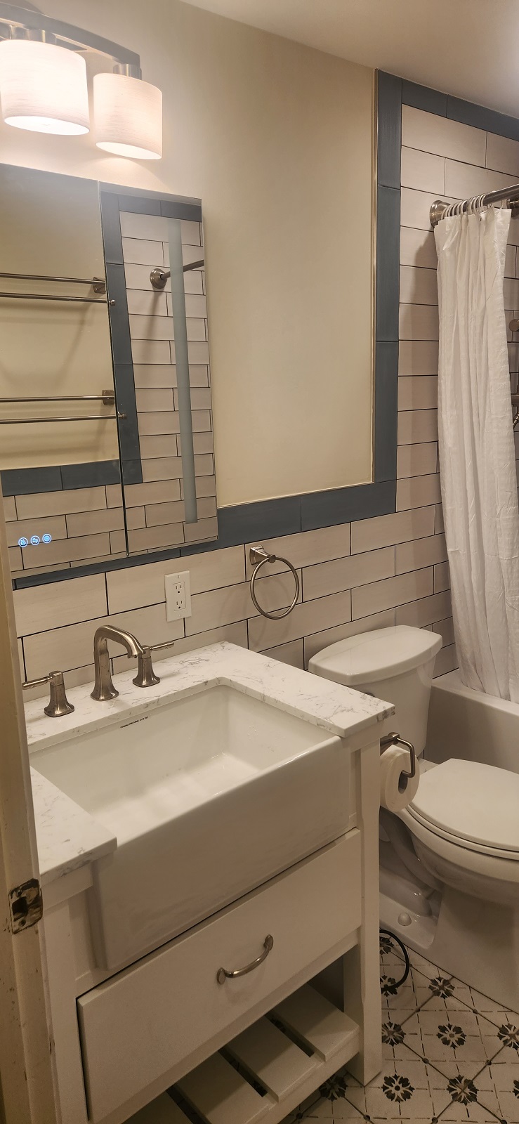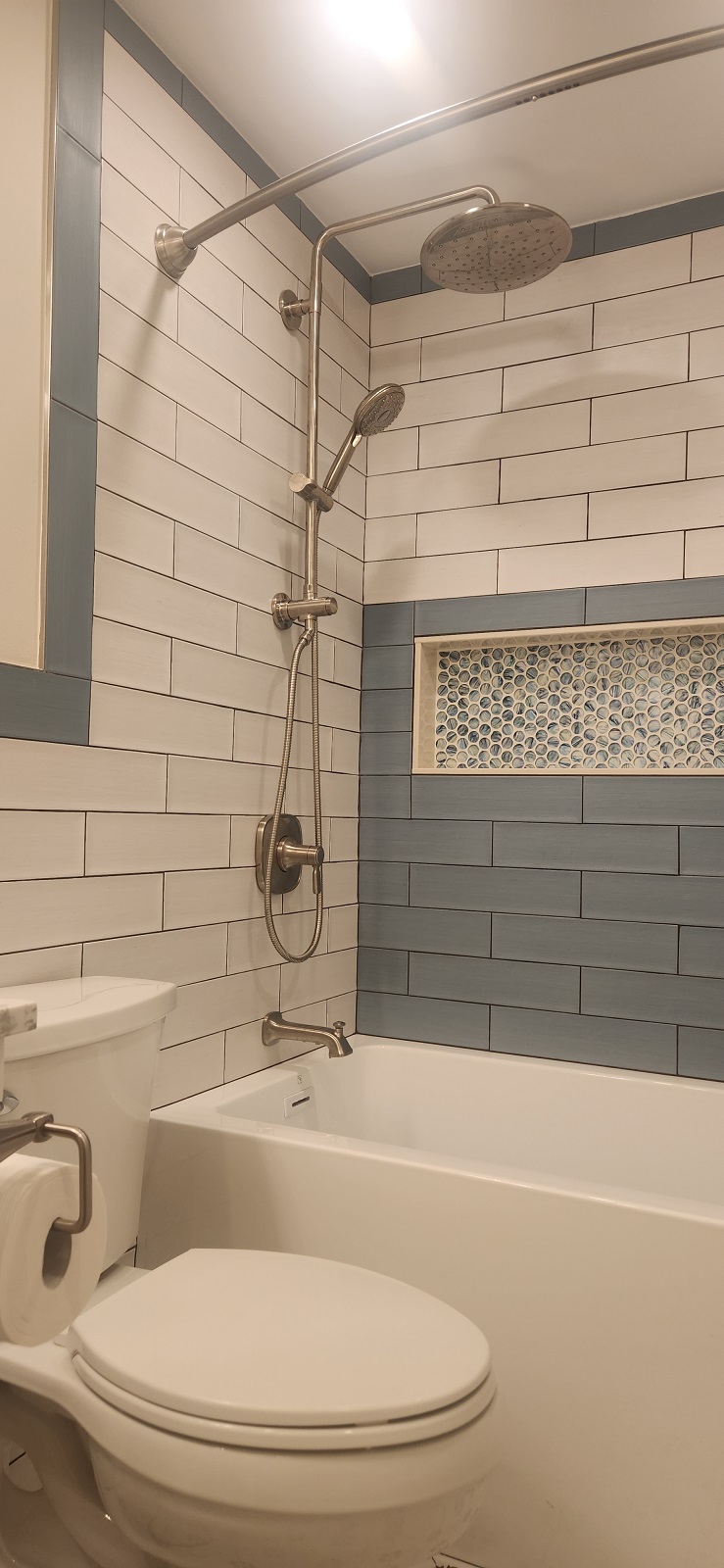 Bathroom / Bathroom / By Kon New tiles around the tub and floor, recessed medicine cabinet and vanity. Custom tiled niche with mosaic. Two color combination for wall tiles.New shower system.Beautiful vanity.Recessed medicine cabinet.Recessed medicine cabinet.Power outlet for future washlet installation.Deep tub for relaxation.Dark grout makes tile installation stunning.Custom niche with mosaic.