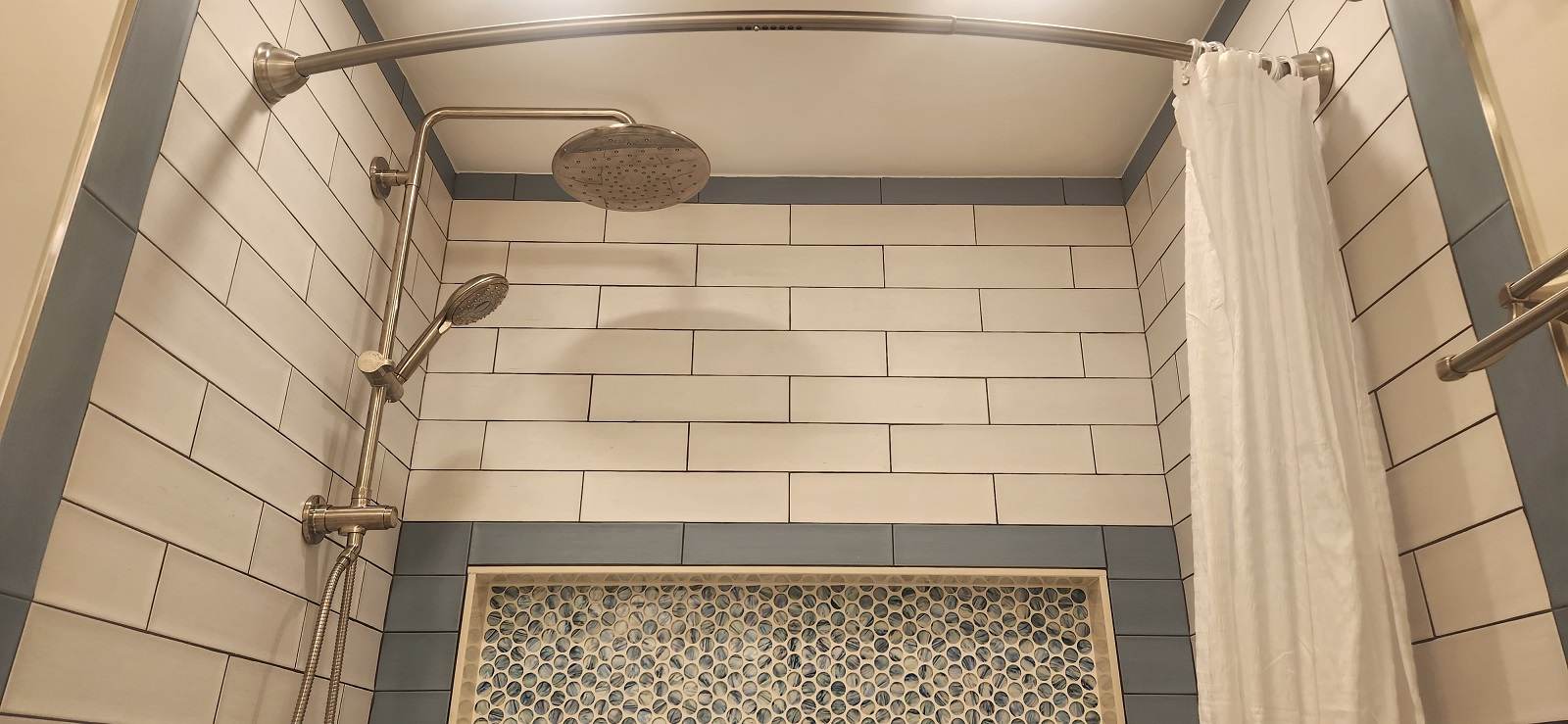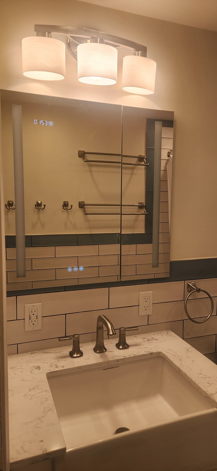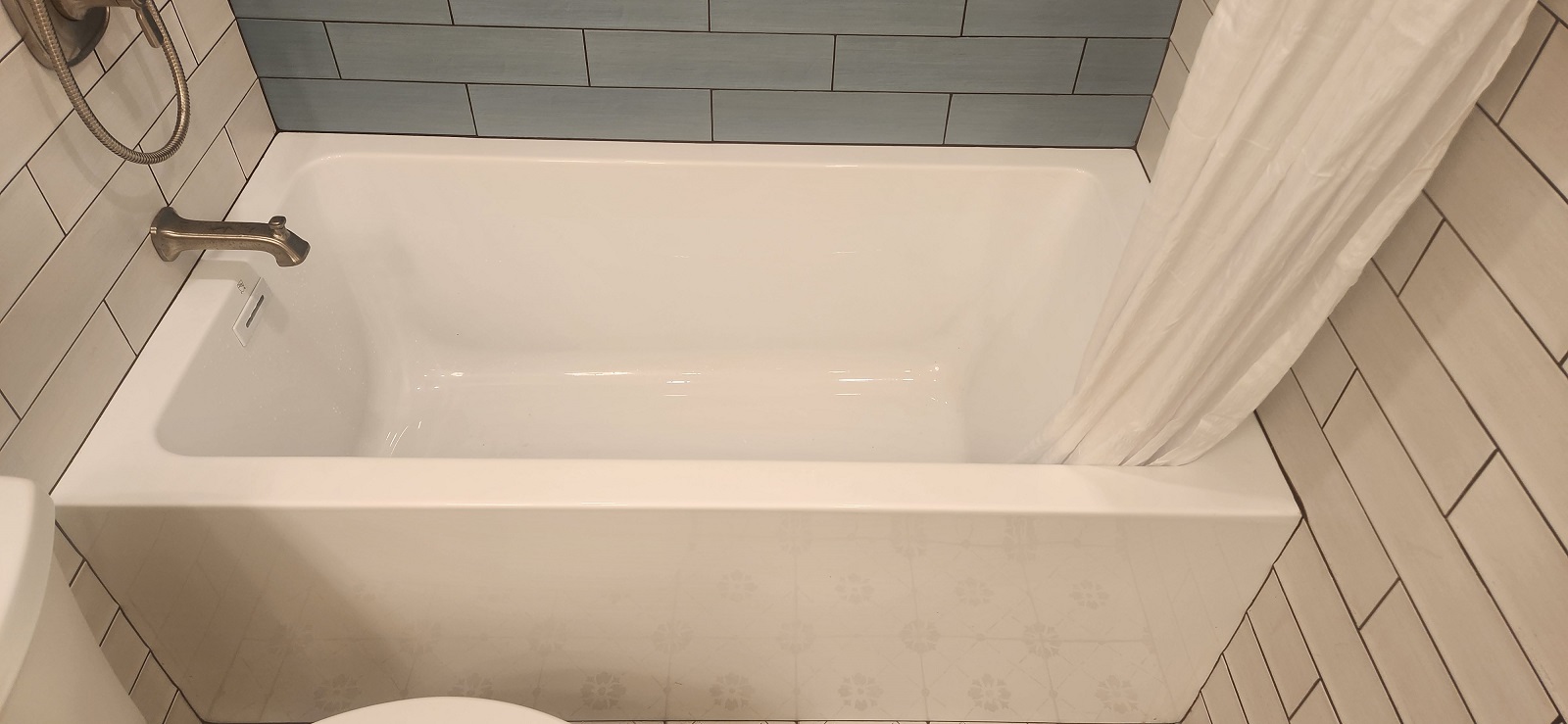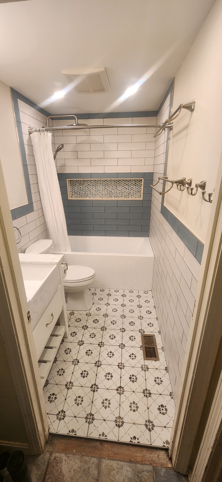 Bathroom / Bathroom / By Kon New tiles around the tub and floor, recessed medicine cabinet and vanity. Custom tiled niche with mosaic. Two color combination for wall tiles.New shower system.Beautiful vanity.Recessed medicine cabinet.Recessed medicine cabinet.Power outlet for future washlet installation.Deep tub for relaxation.Dark grout makes tile installation stunning.Custom niche with mosaic.