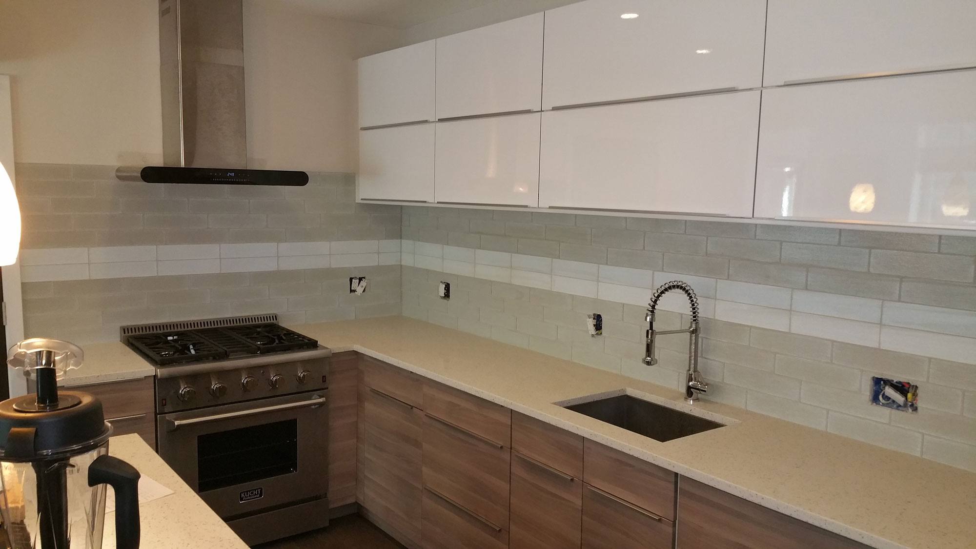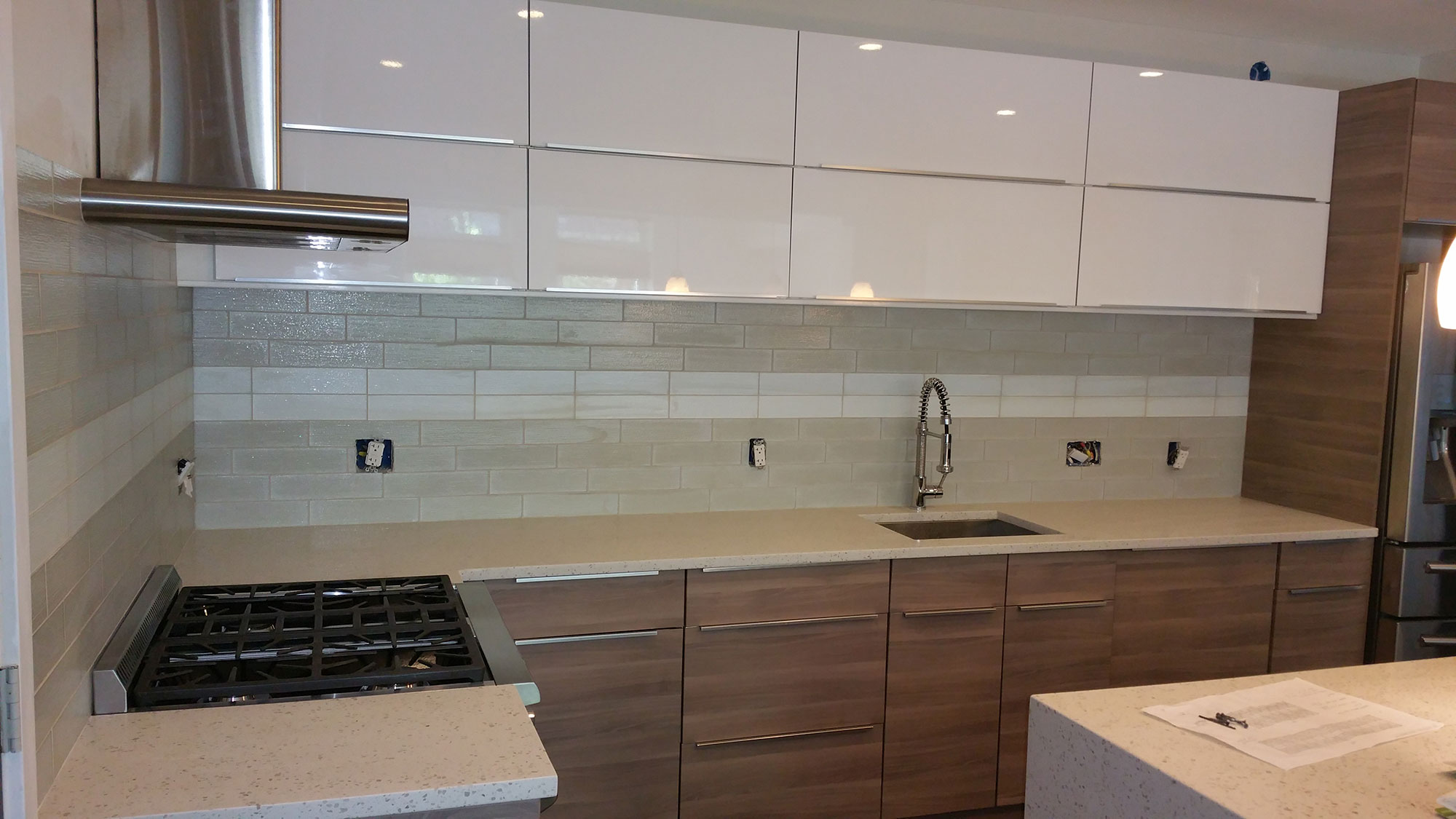 Kitchen Backsplash / Kitchen / By Kon Kitchen backsplash installation with two different colors of glass tiles. Check Before and After. Kitchen Backsplash. Glass tile installation.