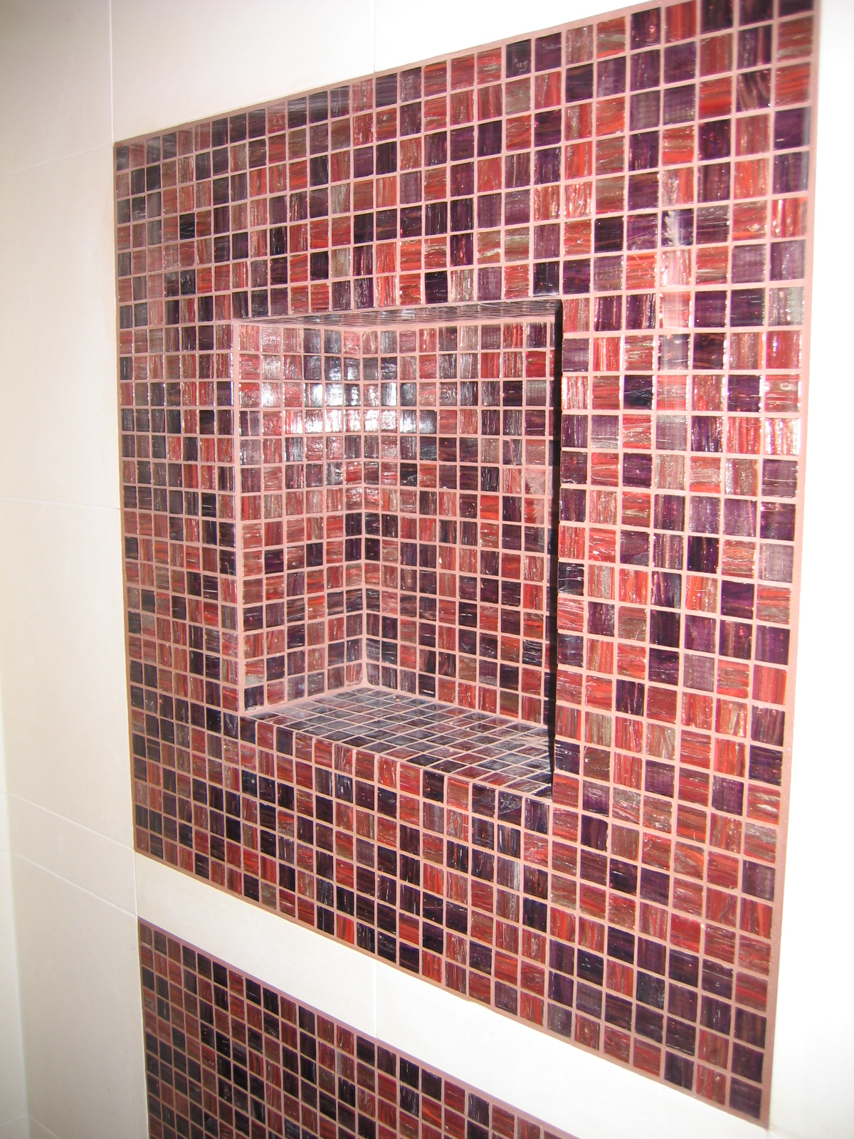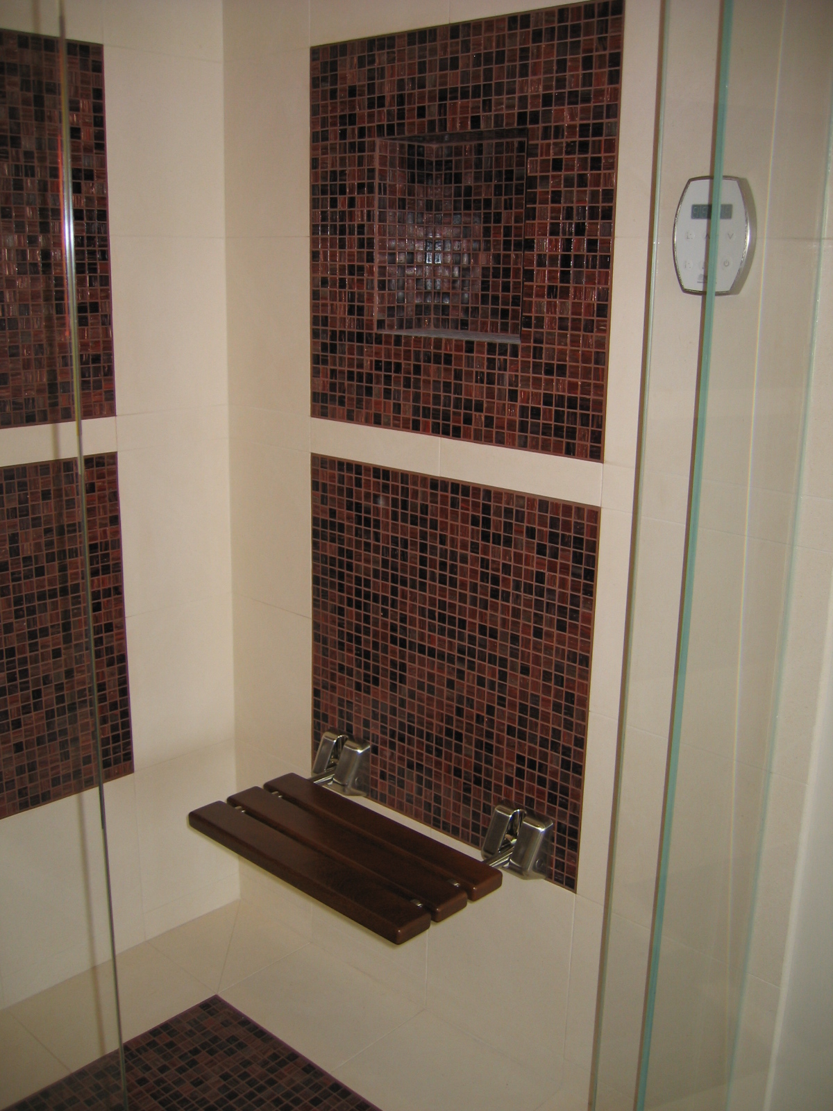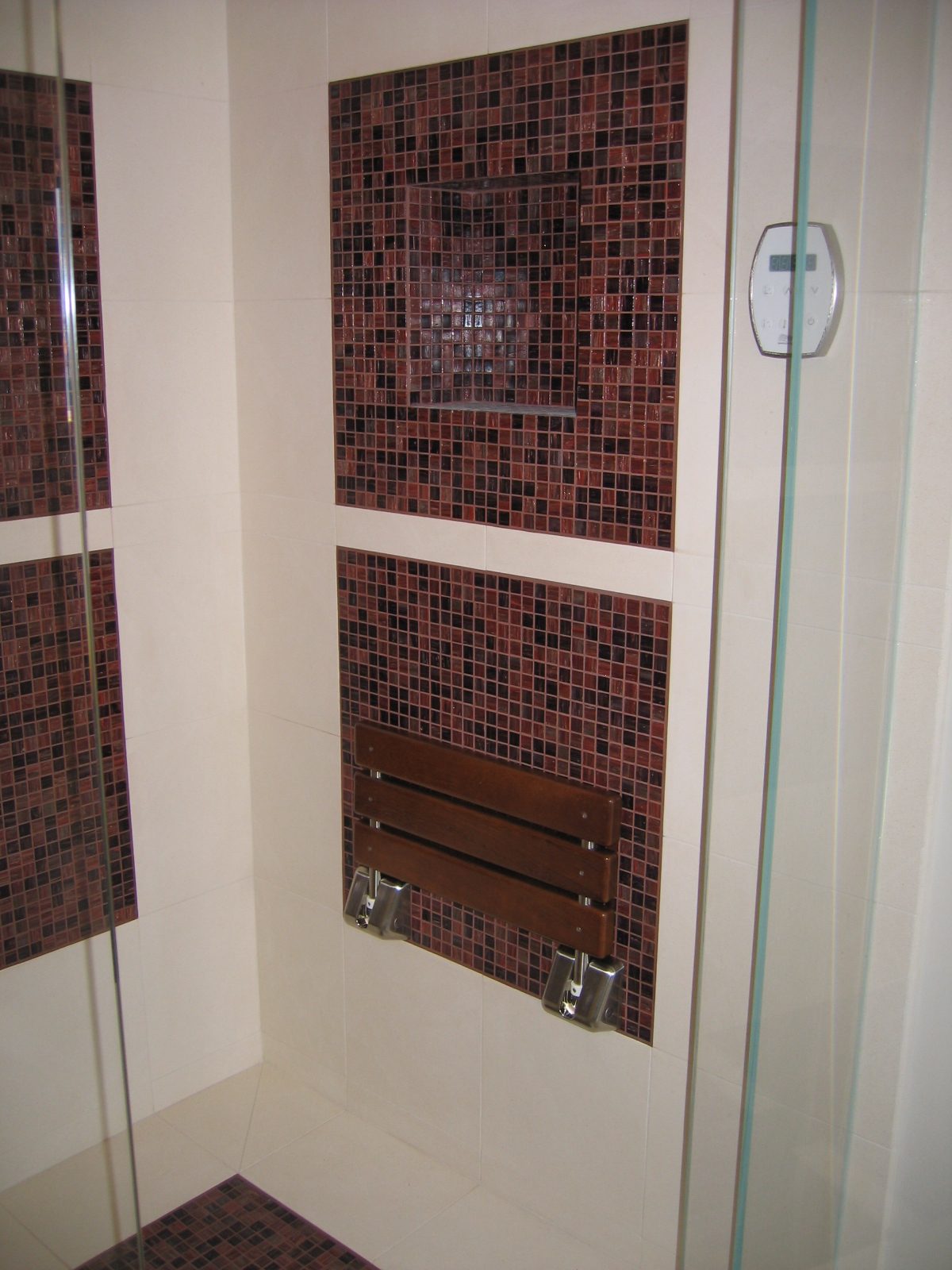 Folding bench inside the steam shower. Glass mosaic on the walls.