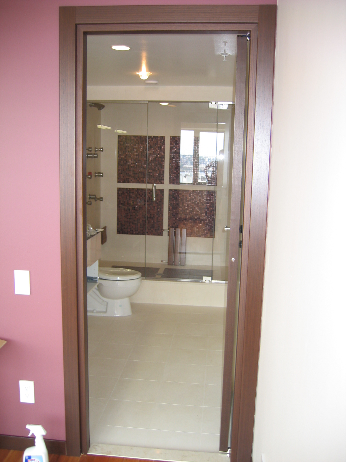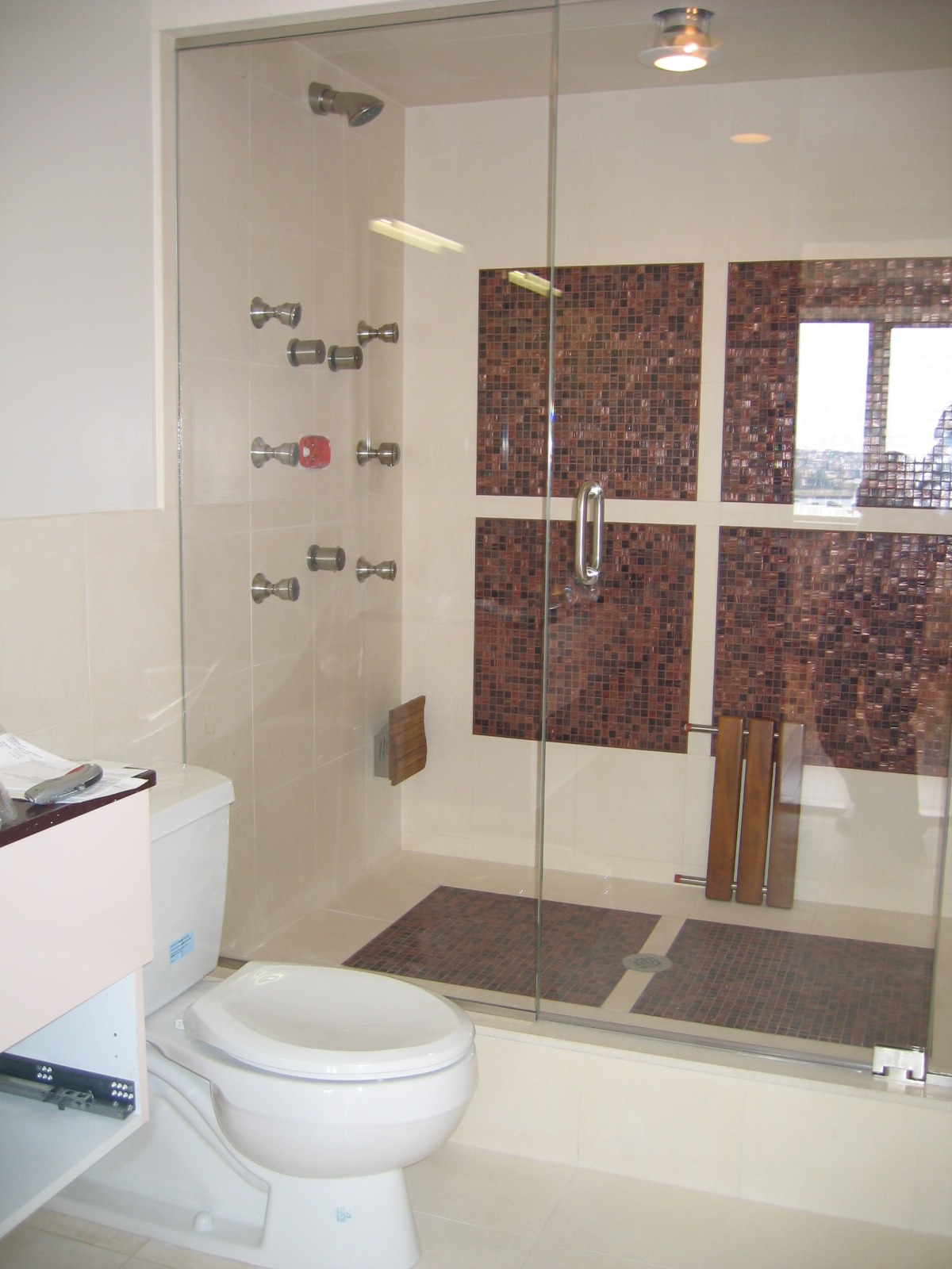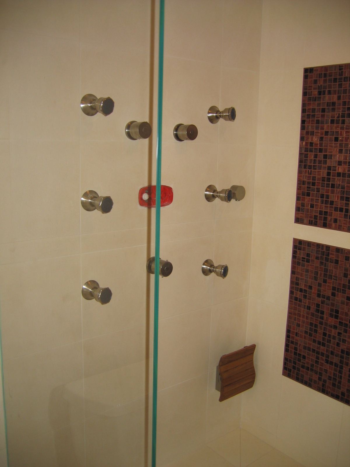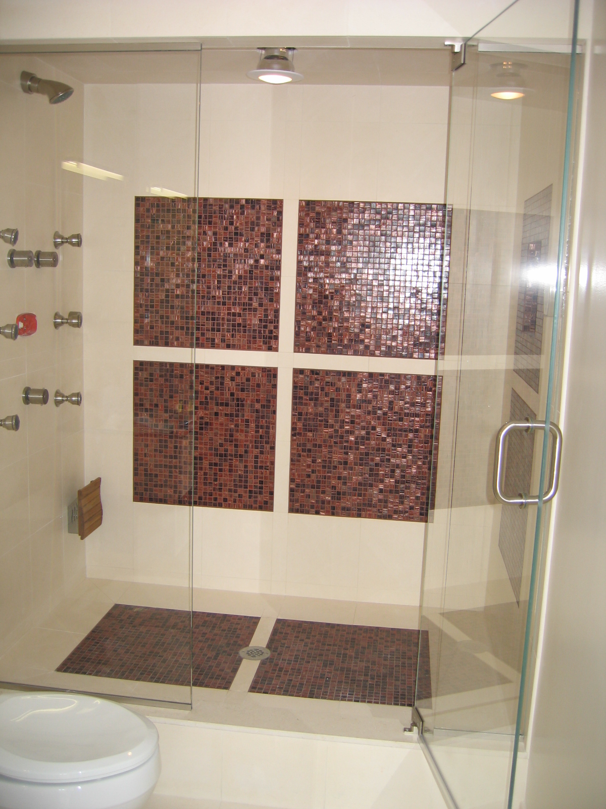 Folding bench inside the steam shower. Glass mosaic on the walls.