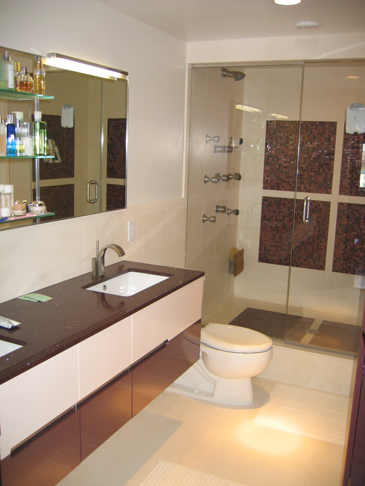 Double sink vanity hanging on a wall. Steam shower on a back.