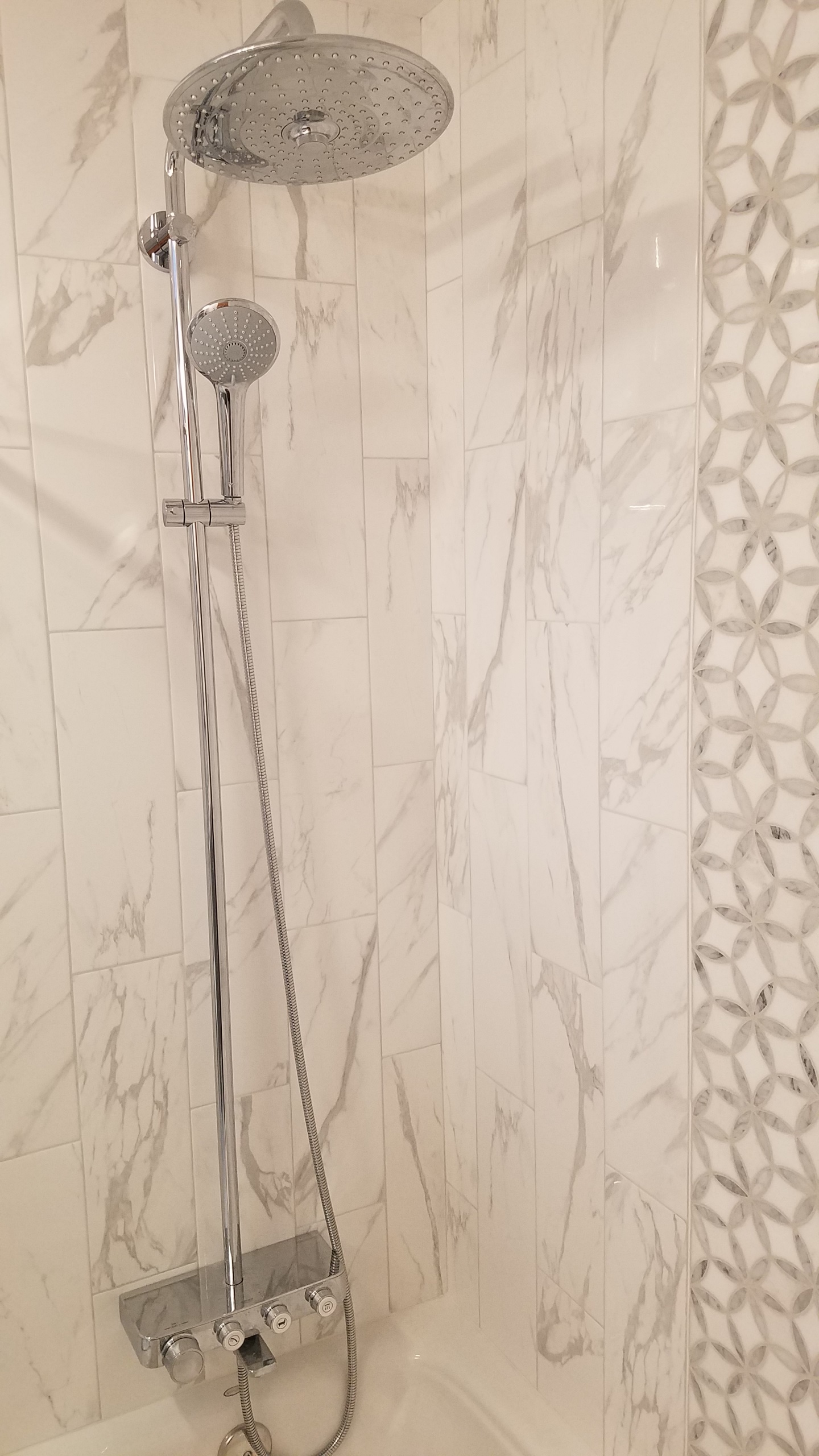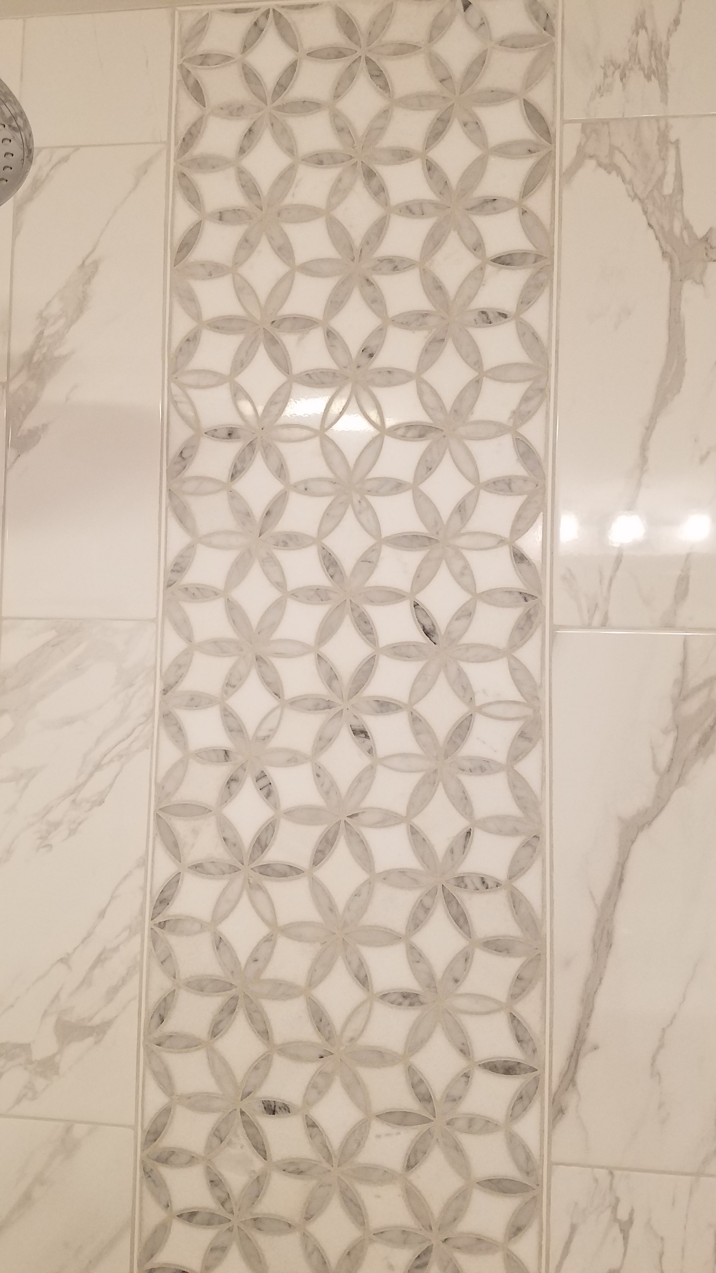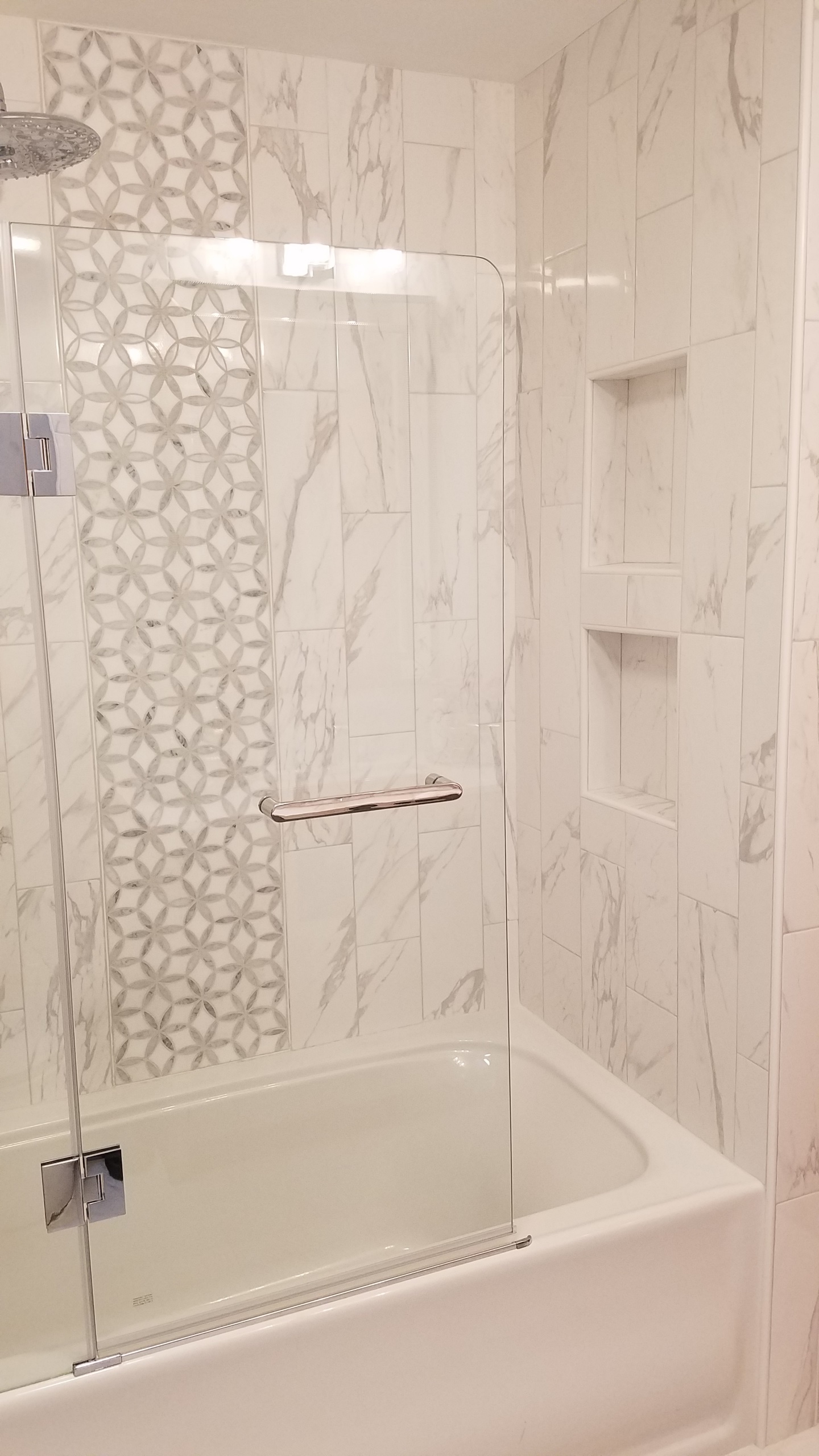 Complete remodeling with tub and toilet relocations. Custom niches and mosaic installation.
