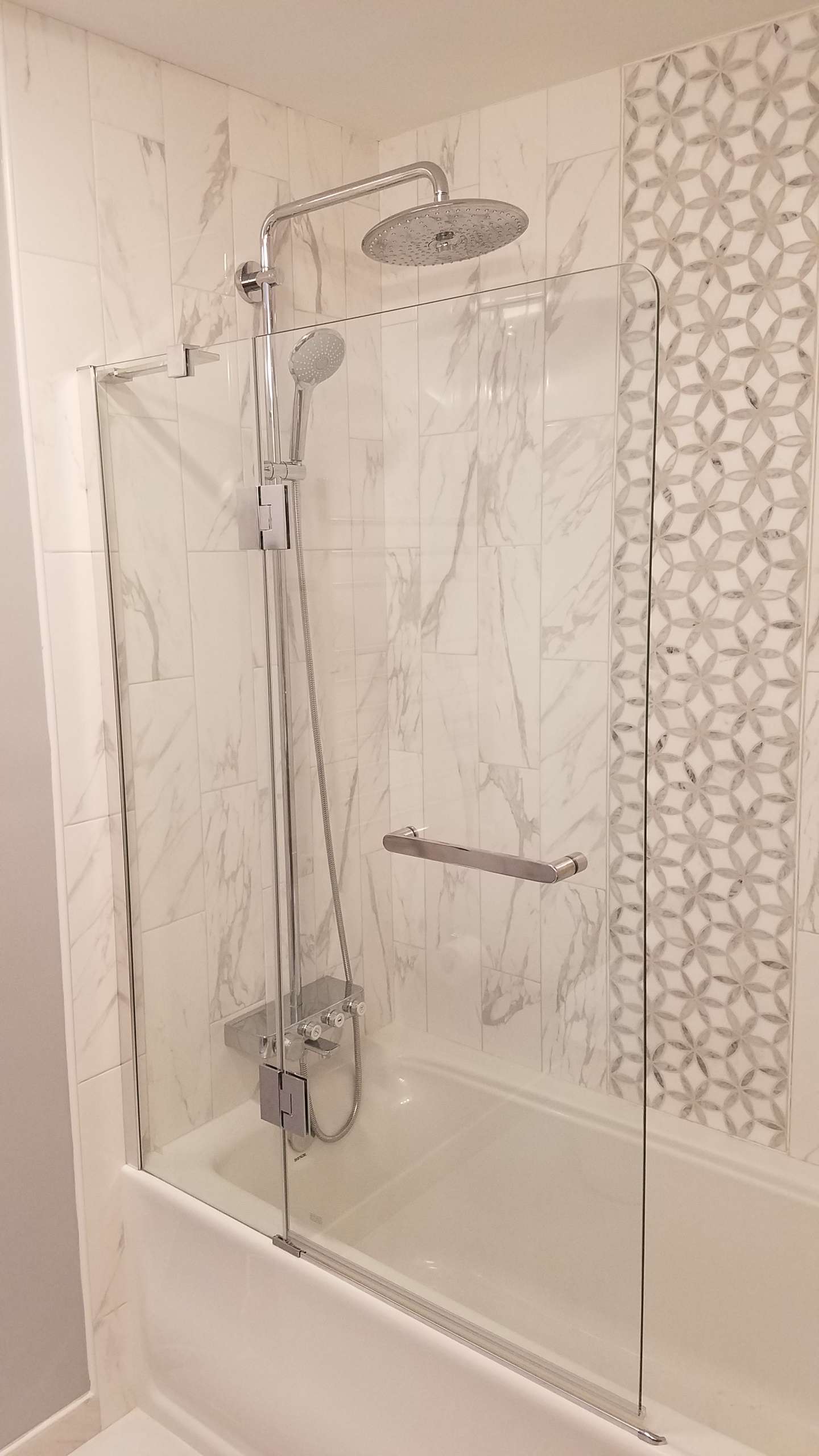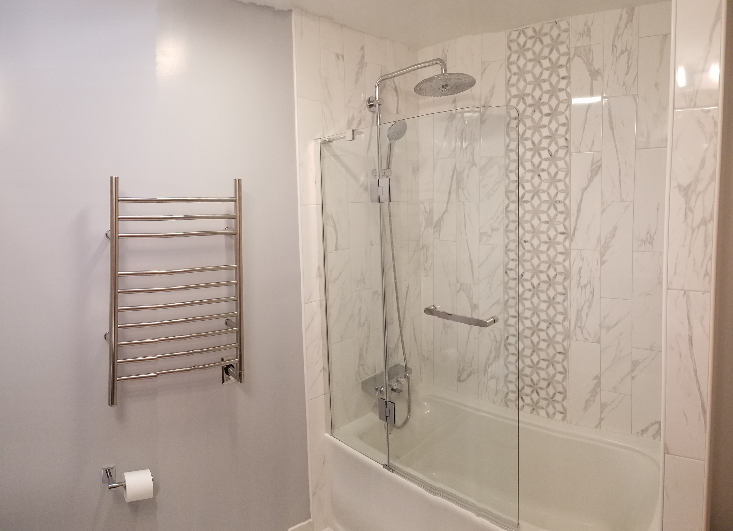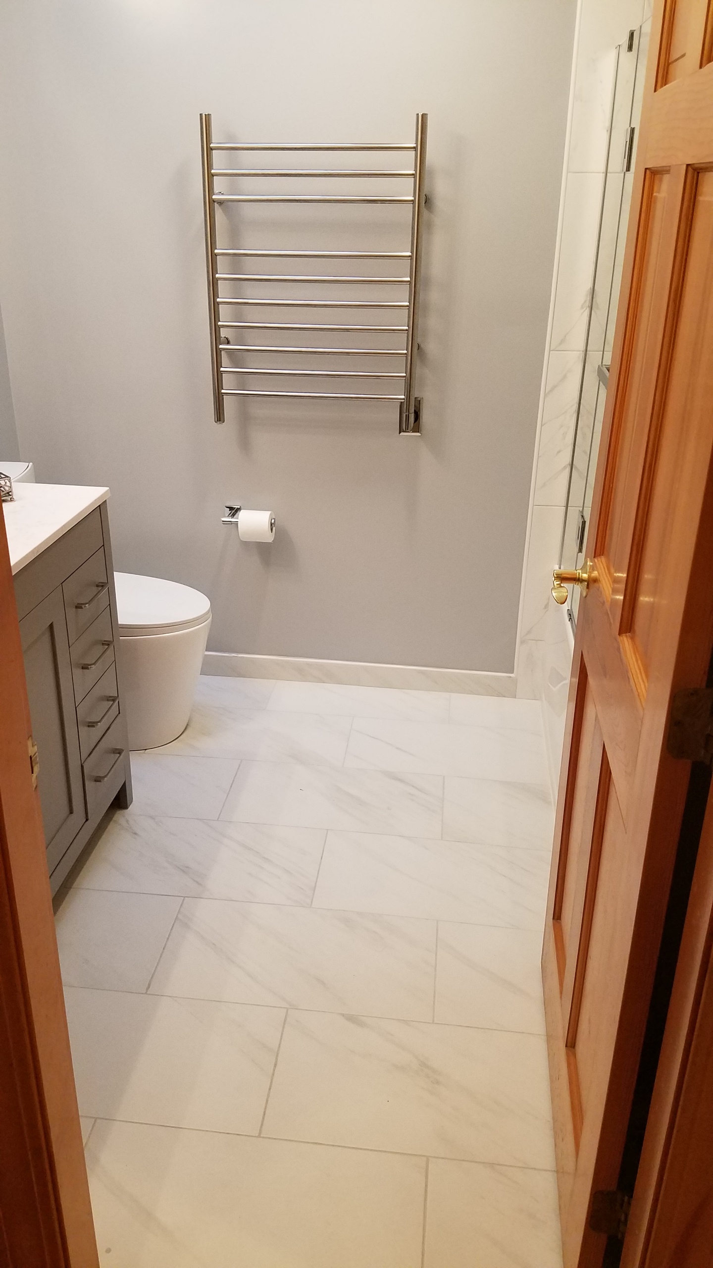 Complete remodeling with tub and toilet relocations. Custom niches and mosaic installation.