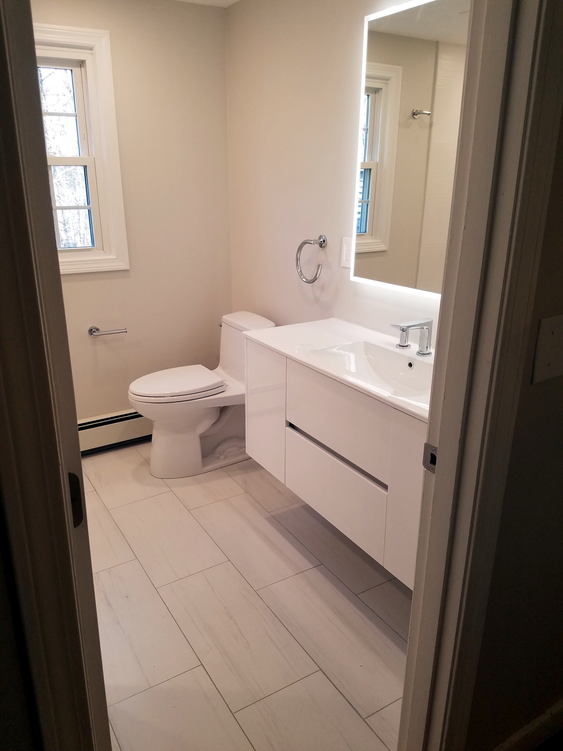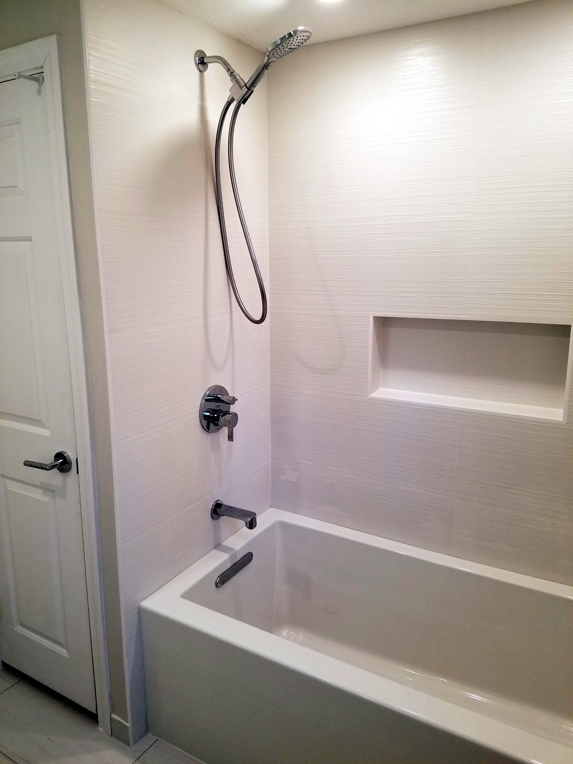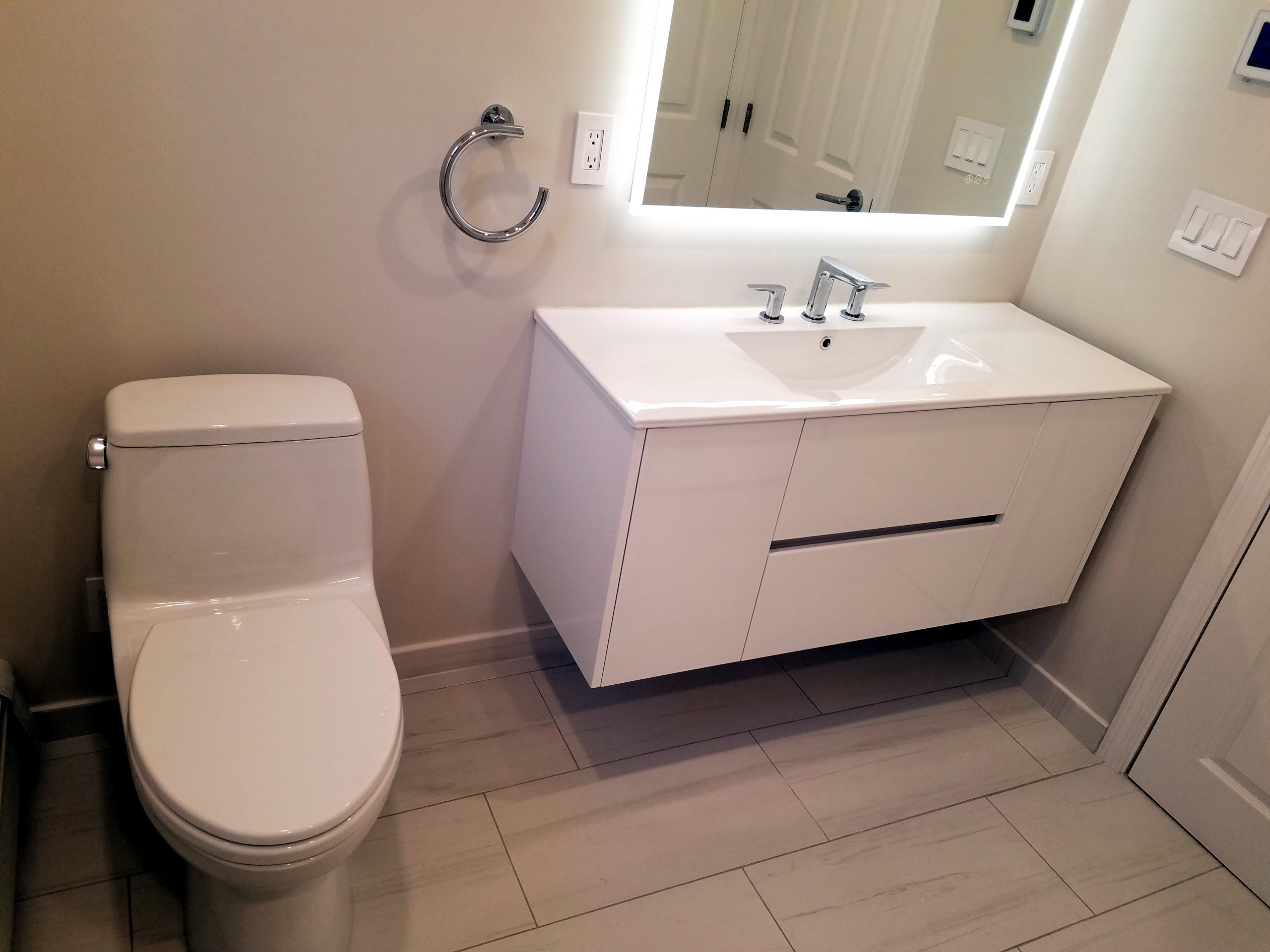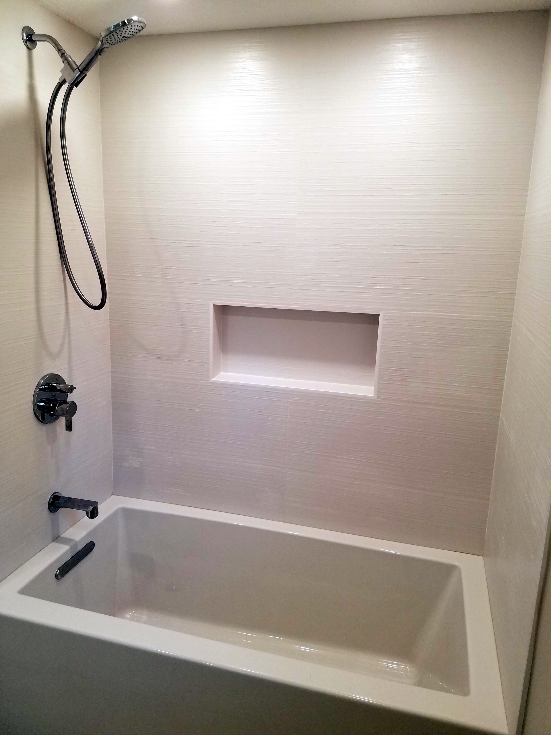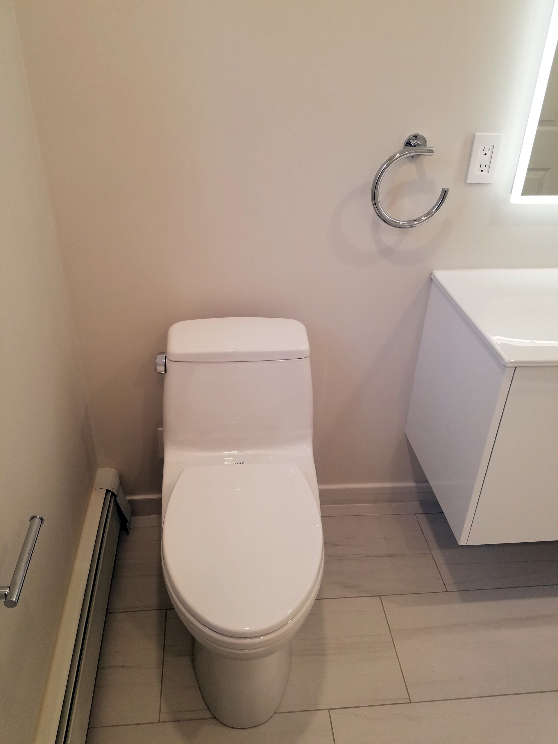 Bathroom / Bathroom / By Kon Complete remodeling with new tiles around the tub and custom niche. New heated tiled floor. Completely renovated bathroom with heated floor.Completely renovated bathroom.New deep tub.New shower system.Hanging vanity with big counter space.New recessed lights.New one peace toilet.Beautiful lighted mirror.Custom tiled niche.Linen closet next to the tub.