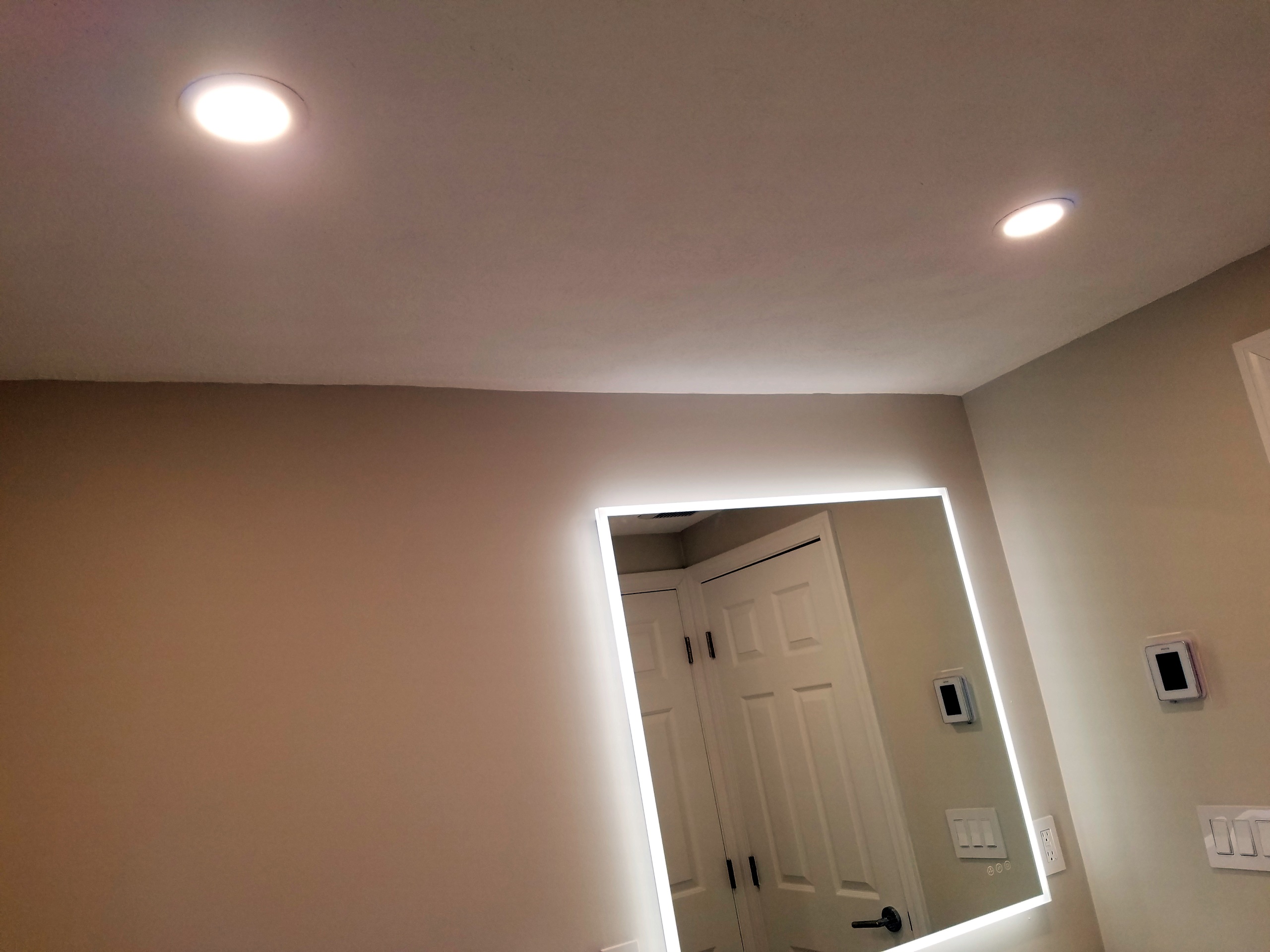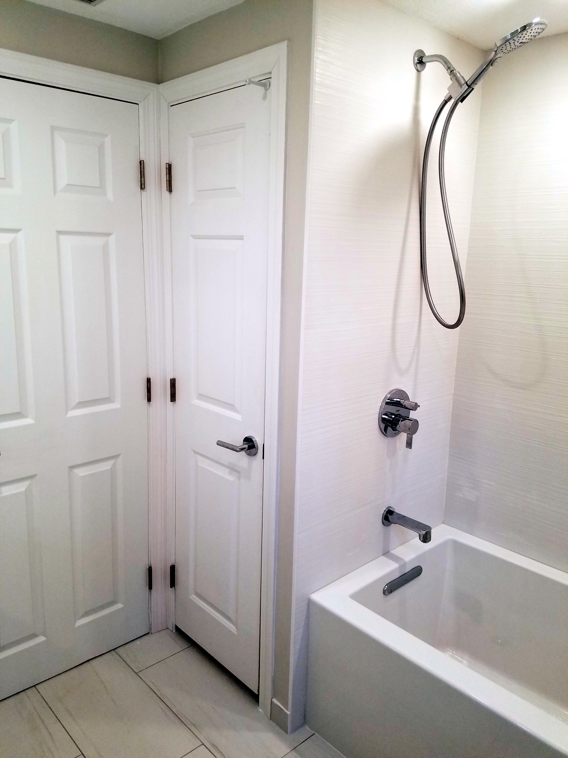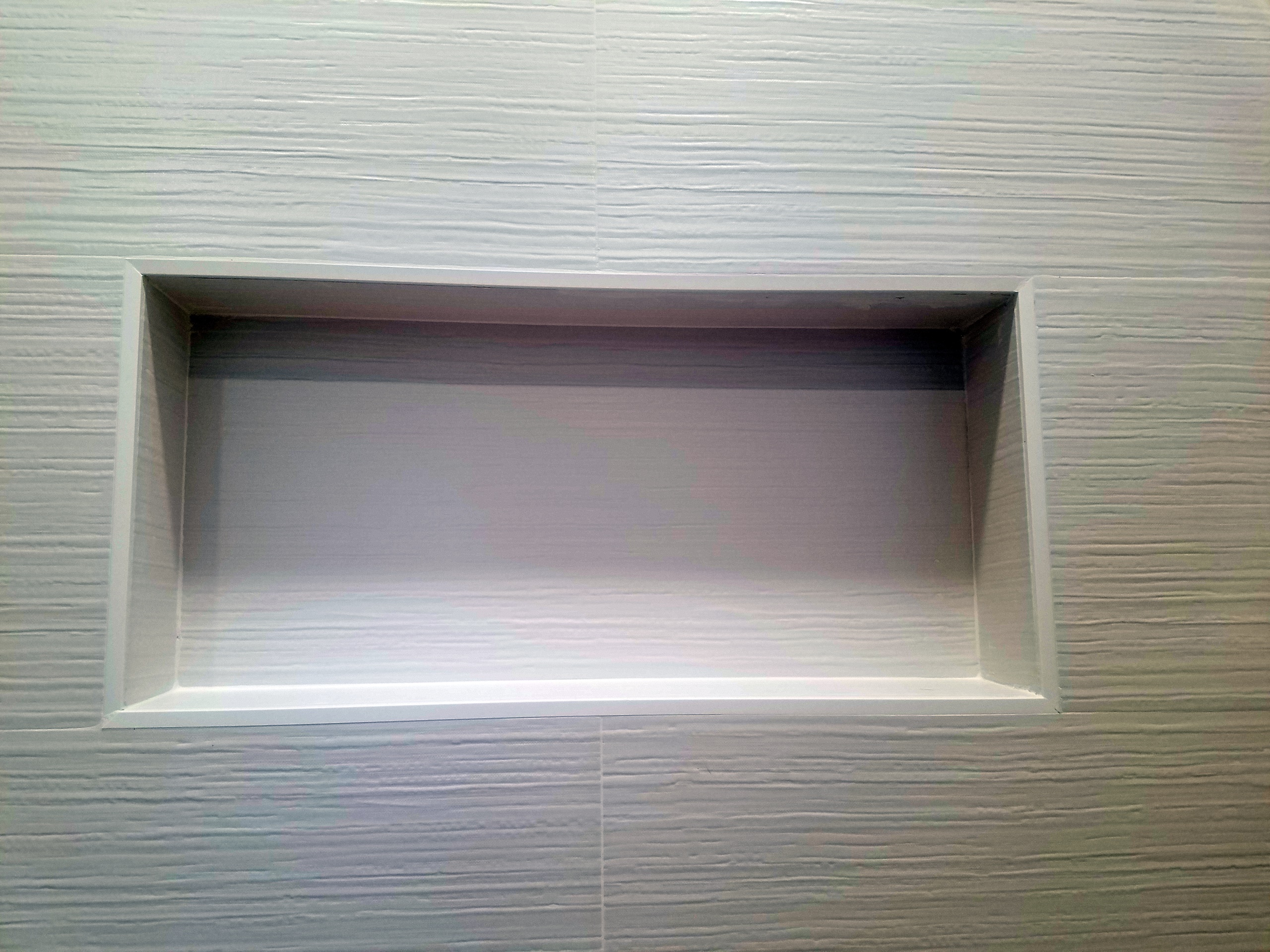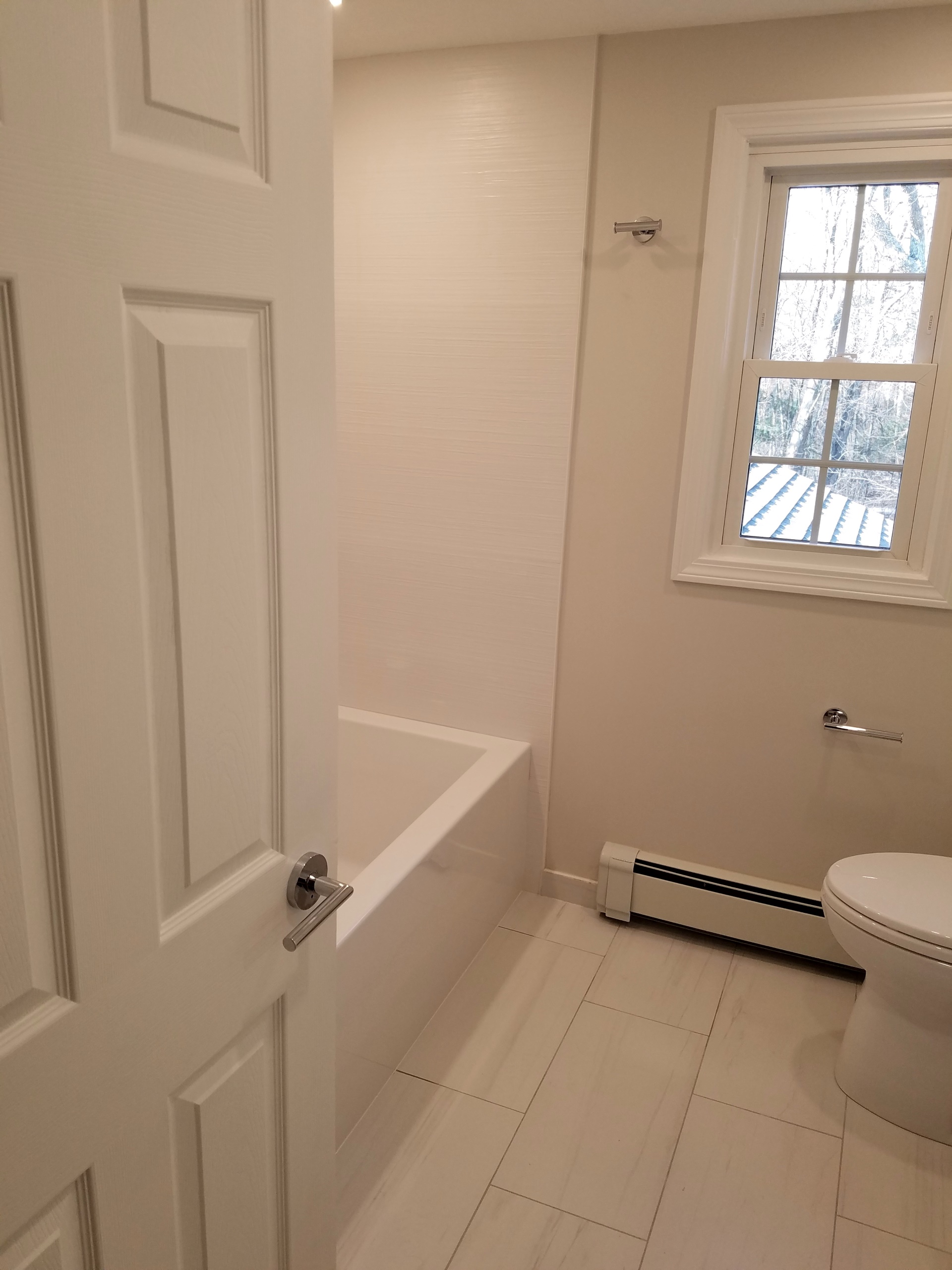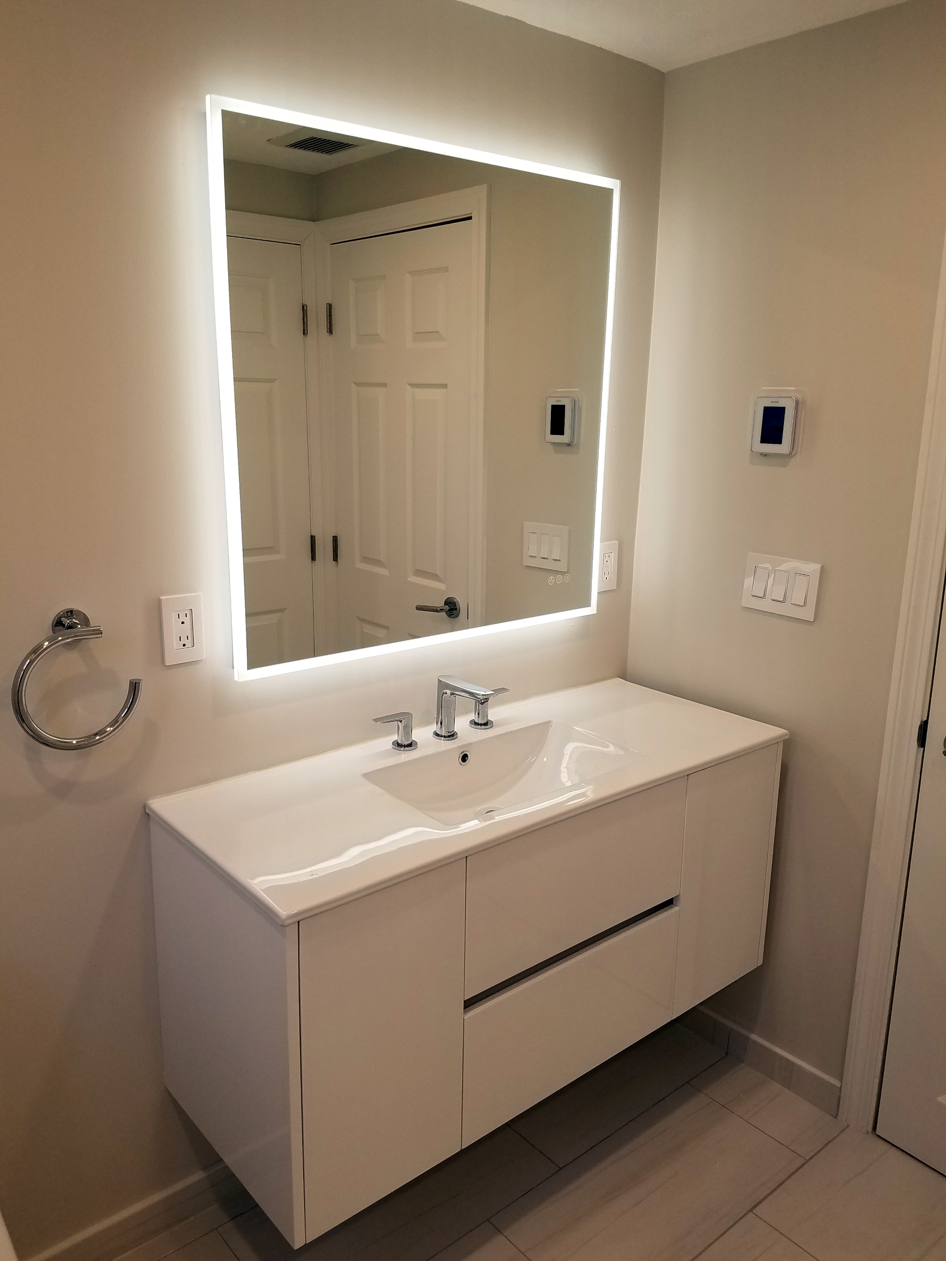 Bathroom / Bathroom / By Kon Complete remodeling with new tiles around the tub and custom niche. New heated tiled floor. Completely renovated bathroom with heated floor.Completely renovated bathroom.New deep tub.New shower system.Hanging vanity with big counter space.New recessed lights.New one peace toilet.Beautiful lighted mirror.Custom tiled niche.Linen closet next to the tub.