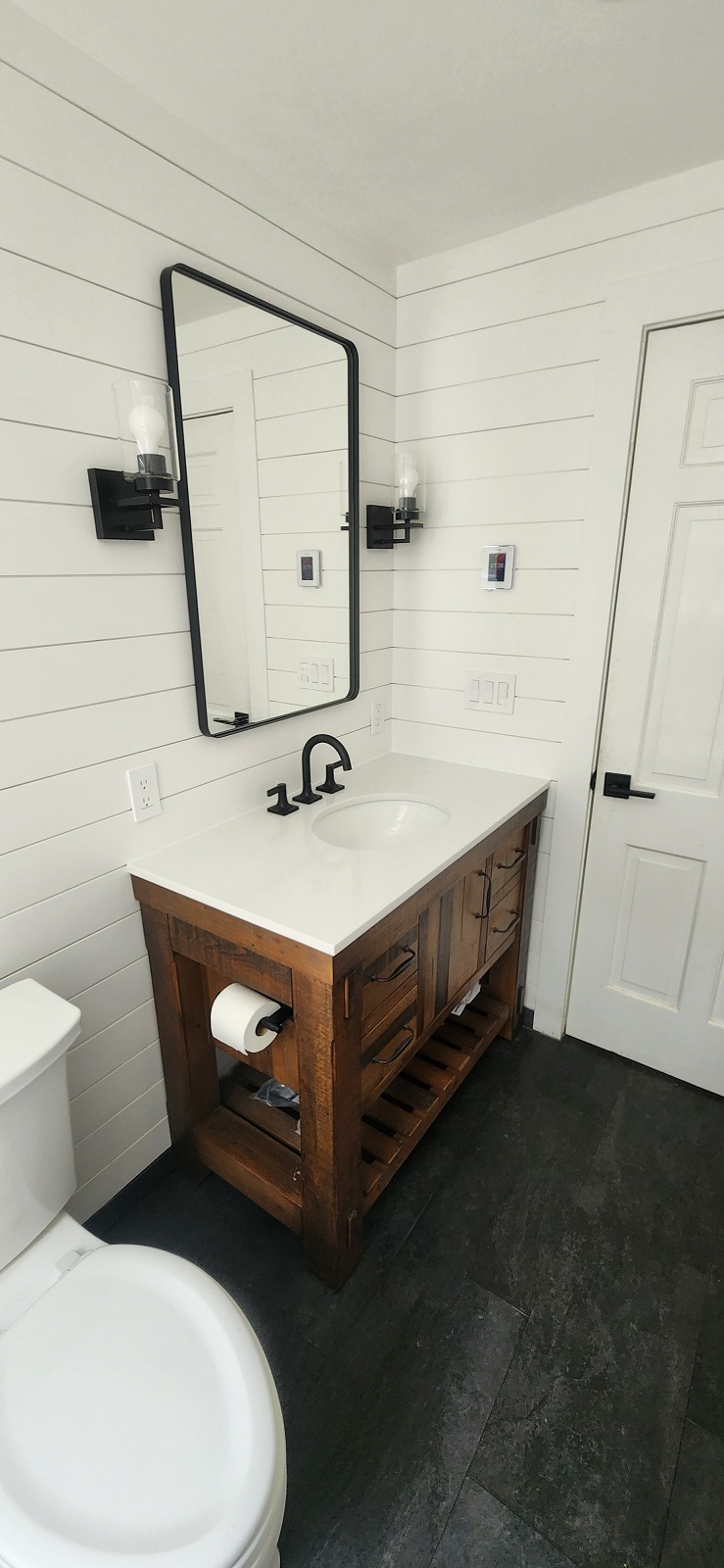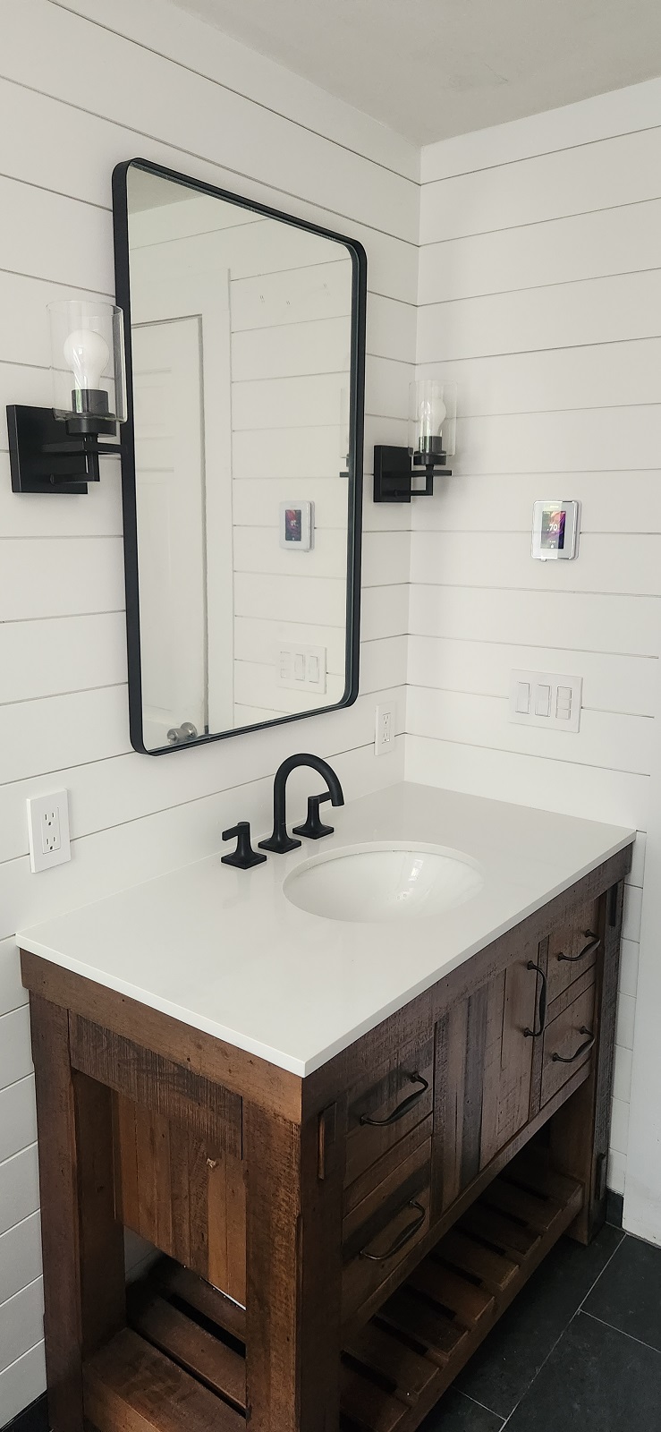 Rustic looking vanity and heated floor.