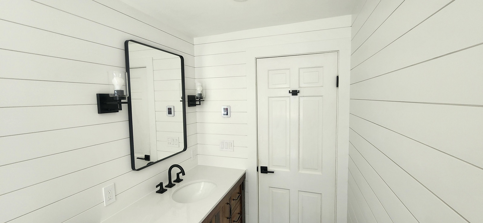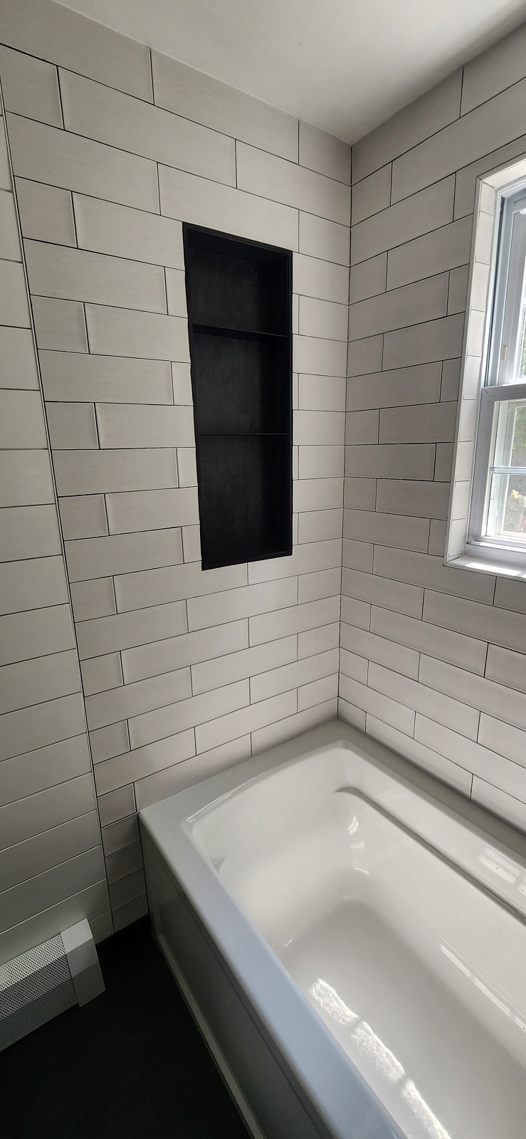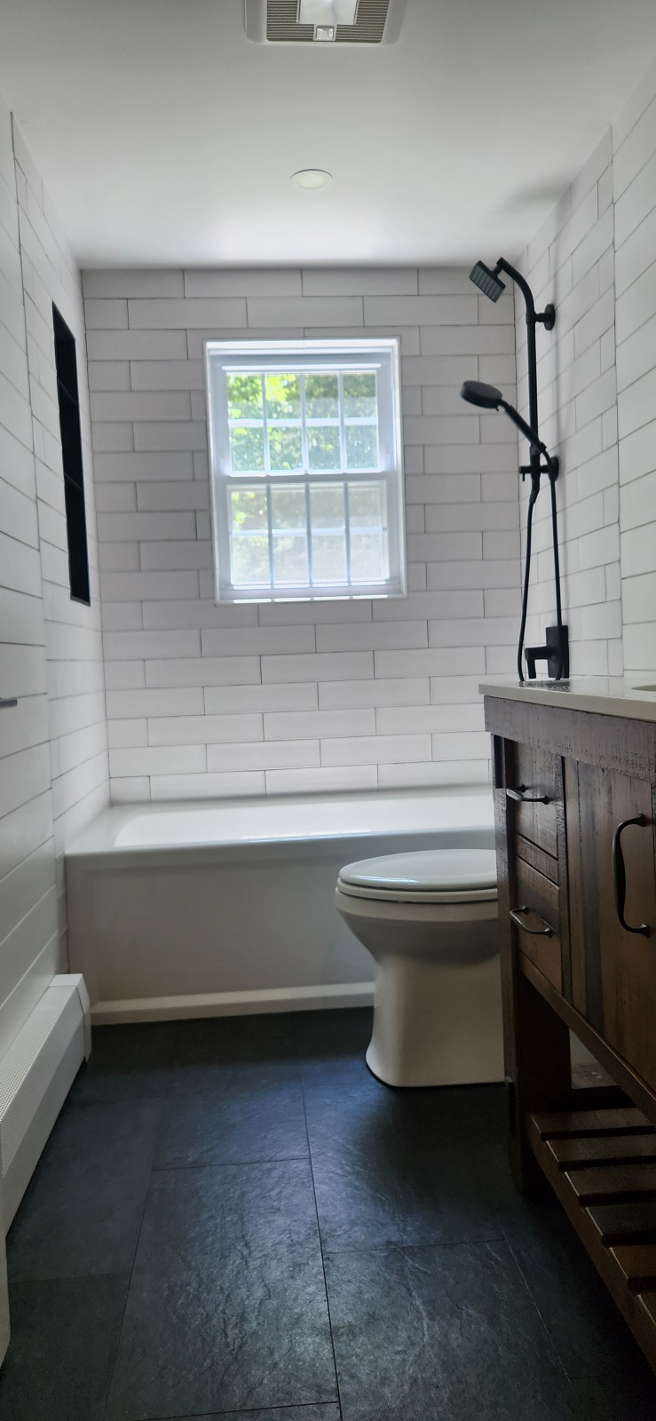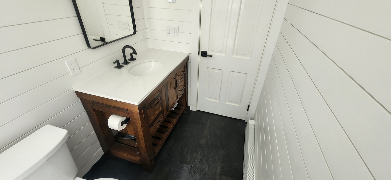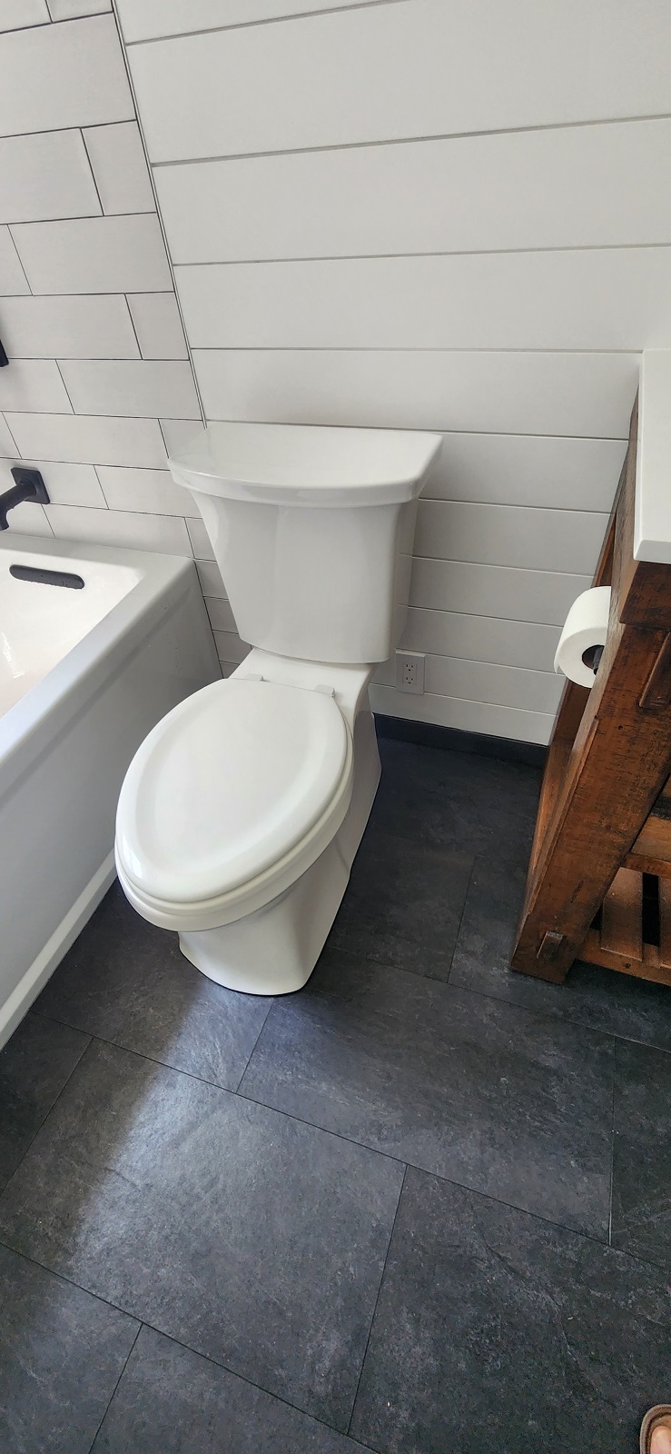 Complete remodeling with heated floor, tiles around the tub and shiplap on the rest of the walls.