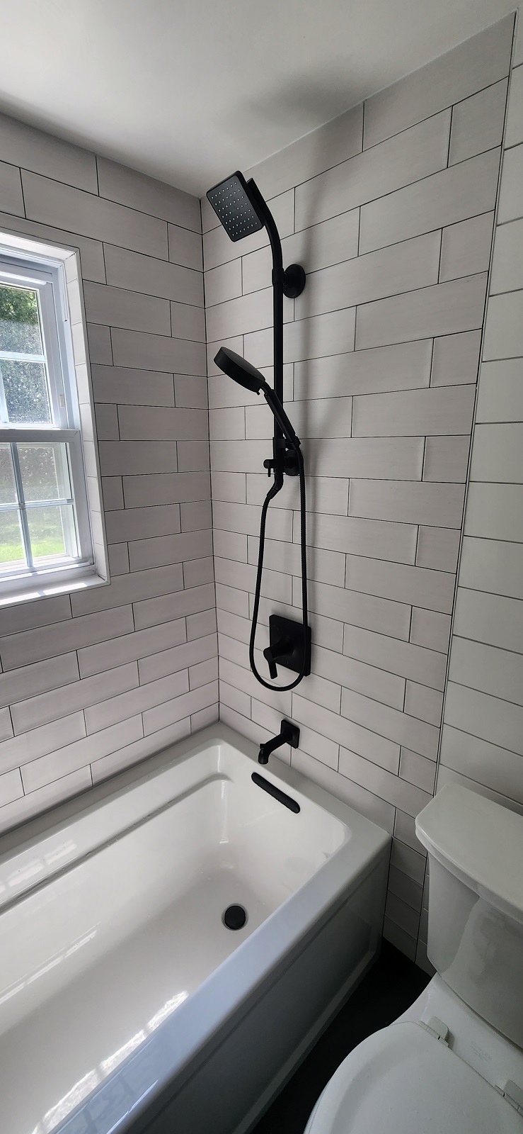 Black shower trim om white tile looks classic.