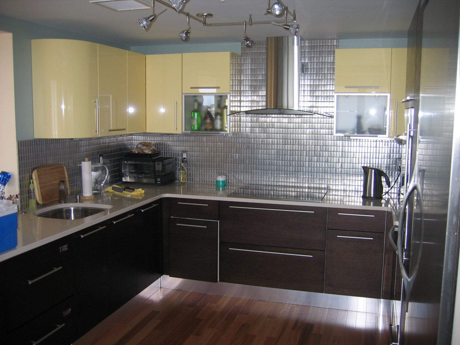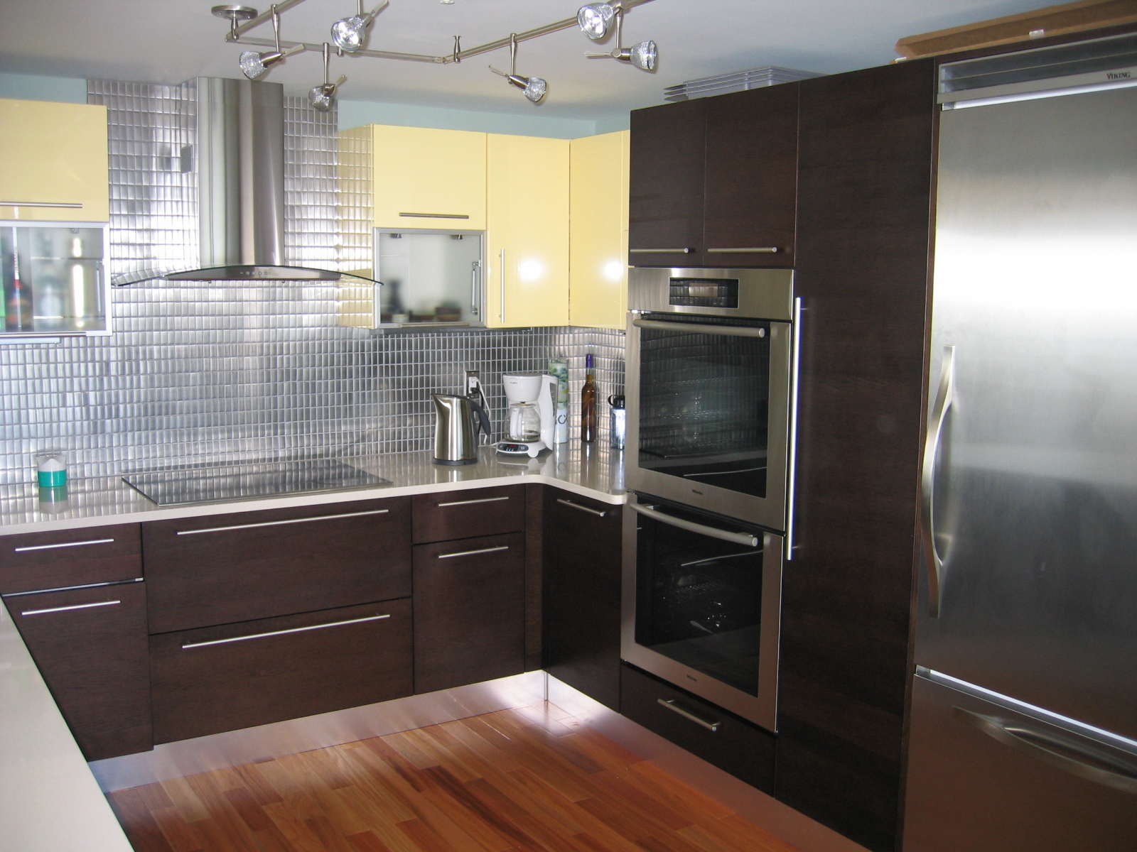 Metal mosaic backsplash and stainless steel appliances.