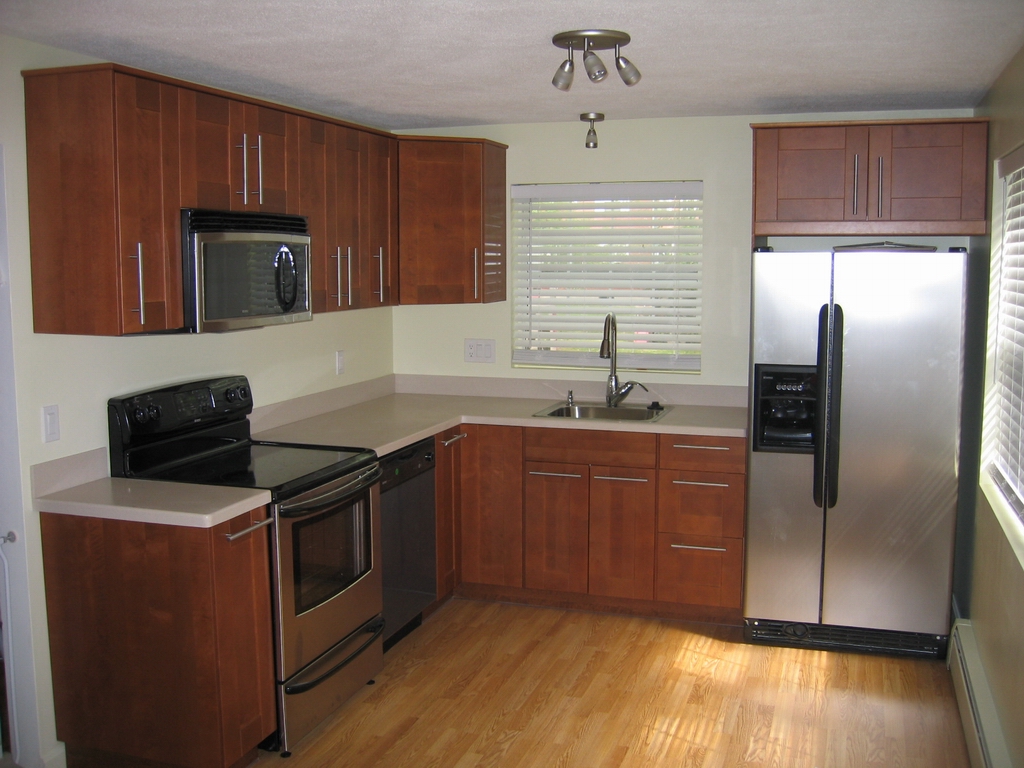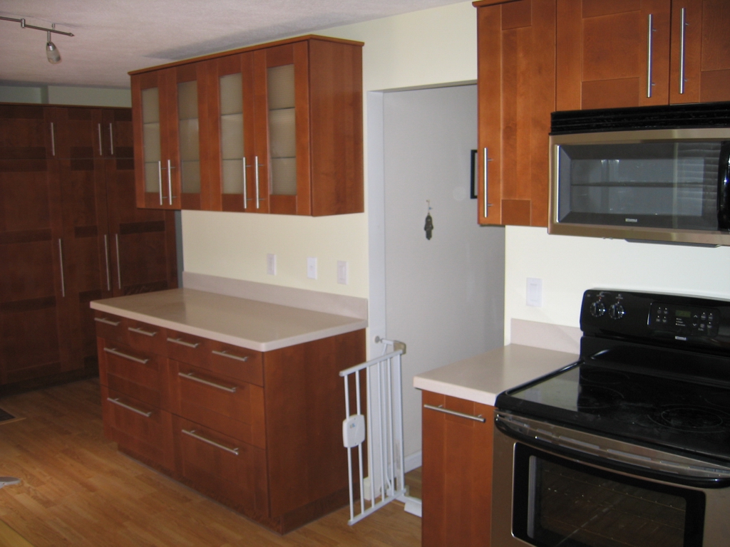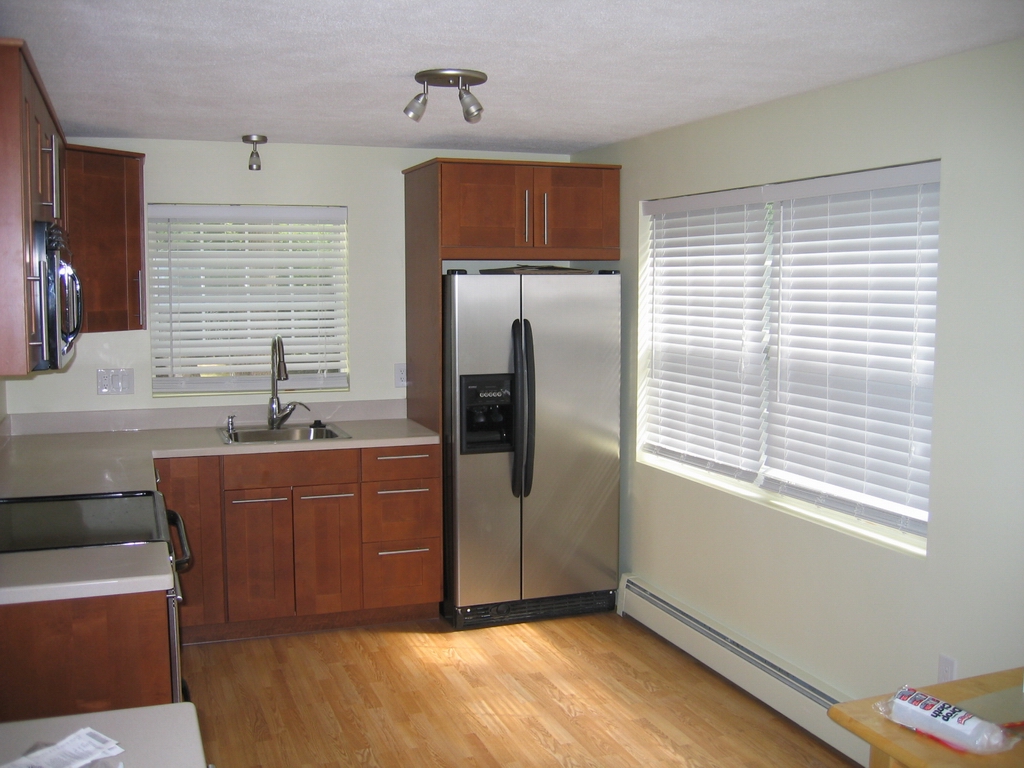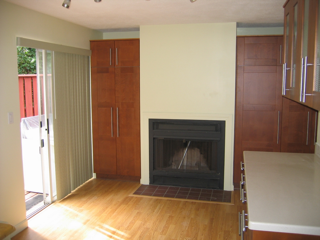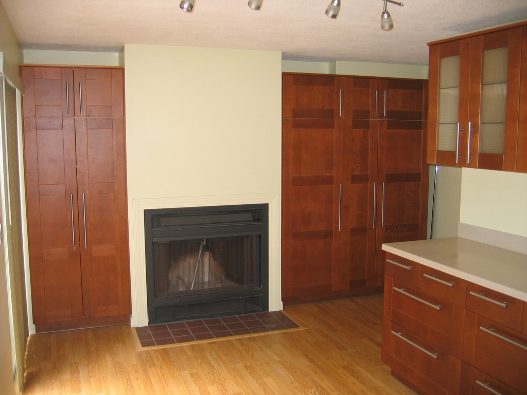 Kitchen / Kitchen / By Kon Building a new kitchen including flooring and painting. Complete kitchen remodeling.Additional storage next to fireplace.Tall cabinets make nice looking wall.Glass doors on the wall cabinets.New flooring.