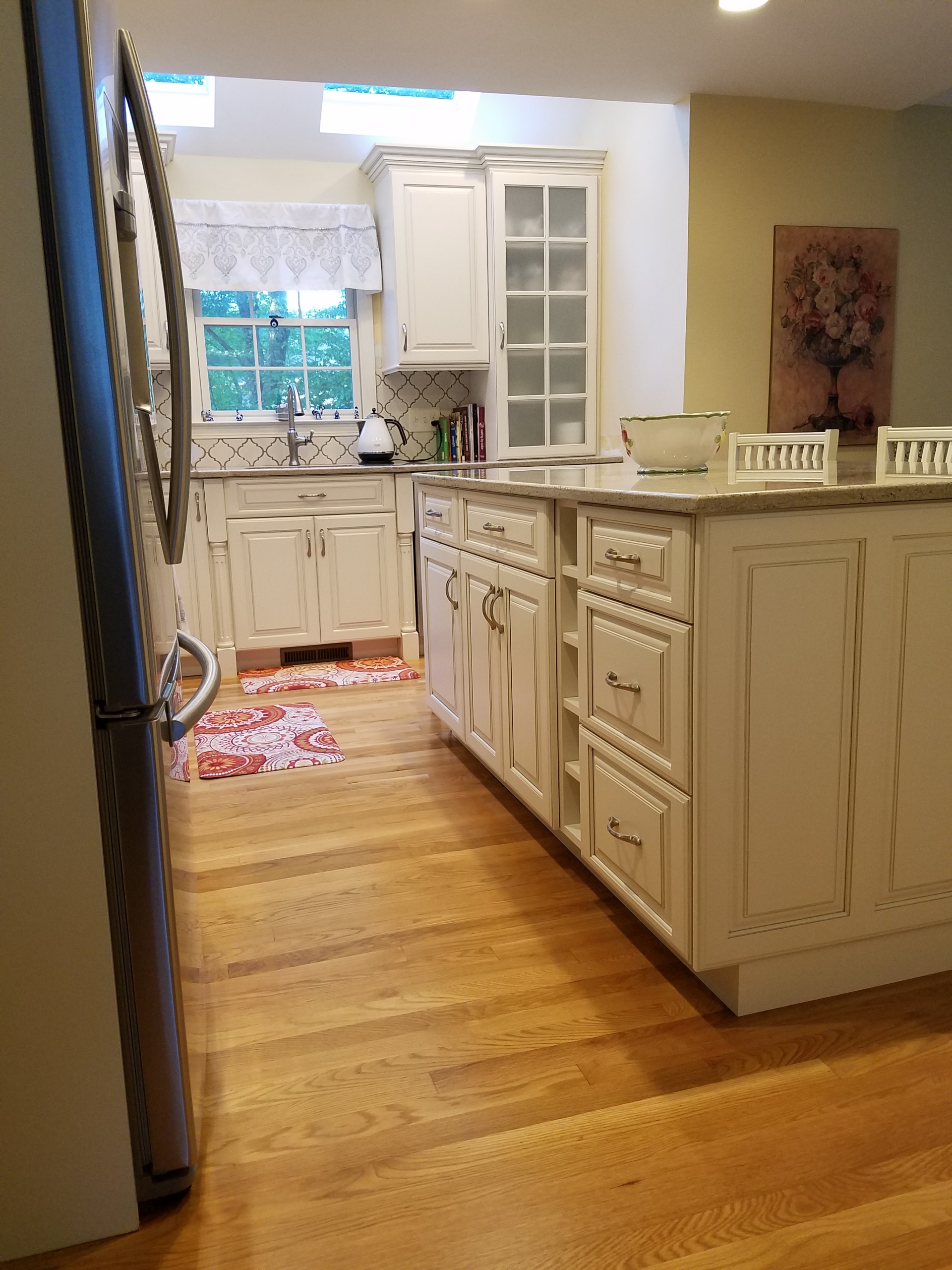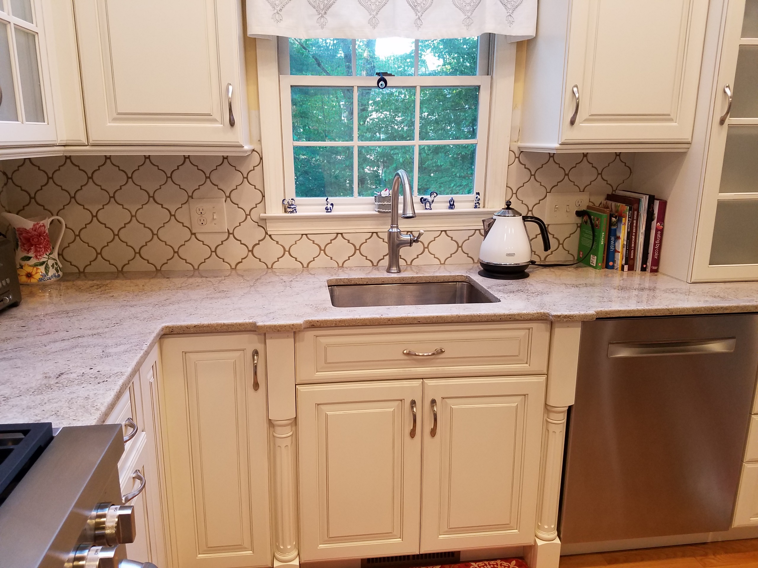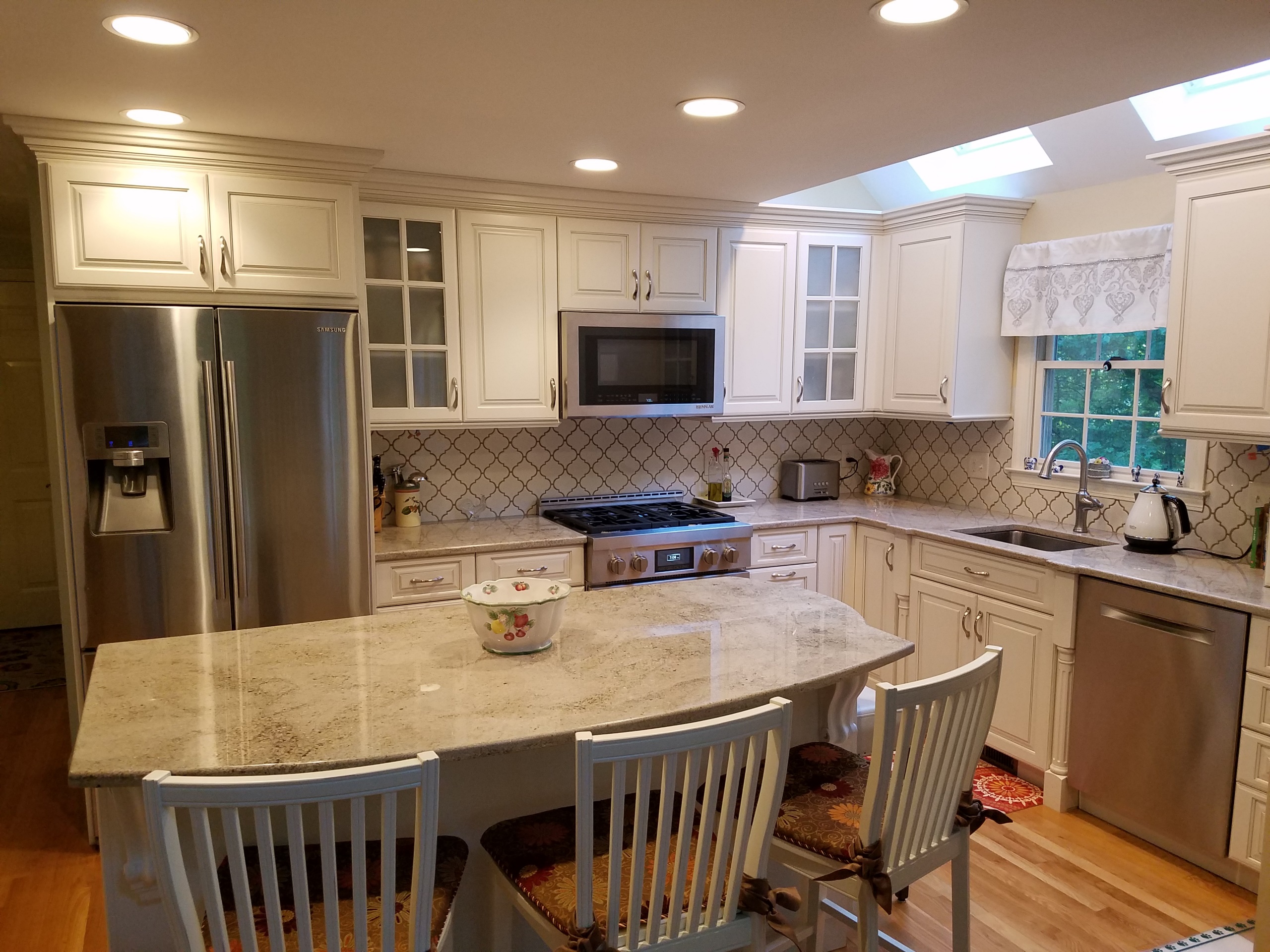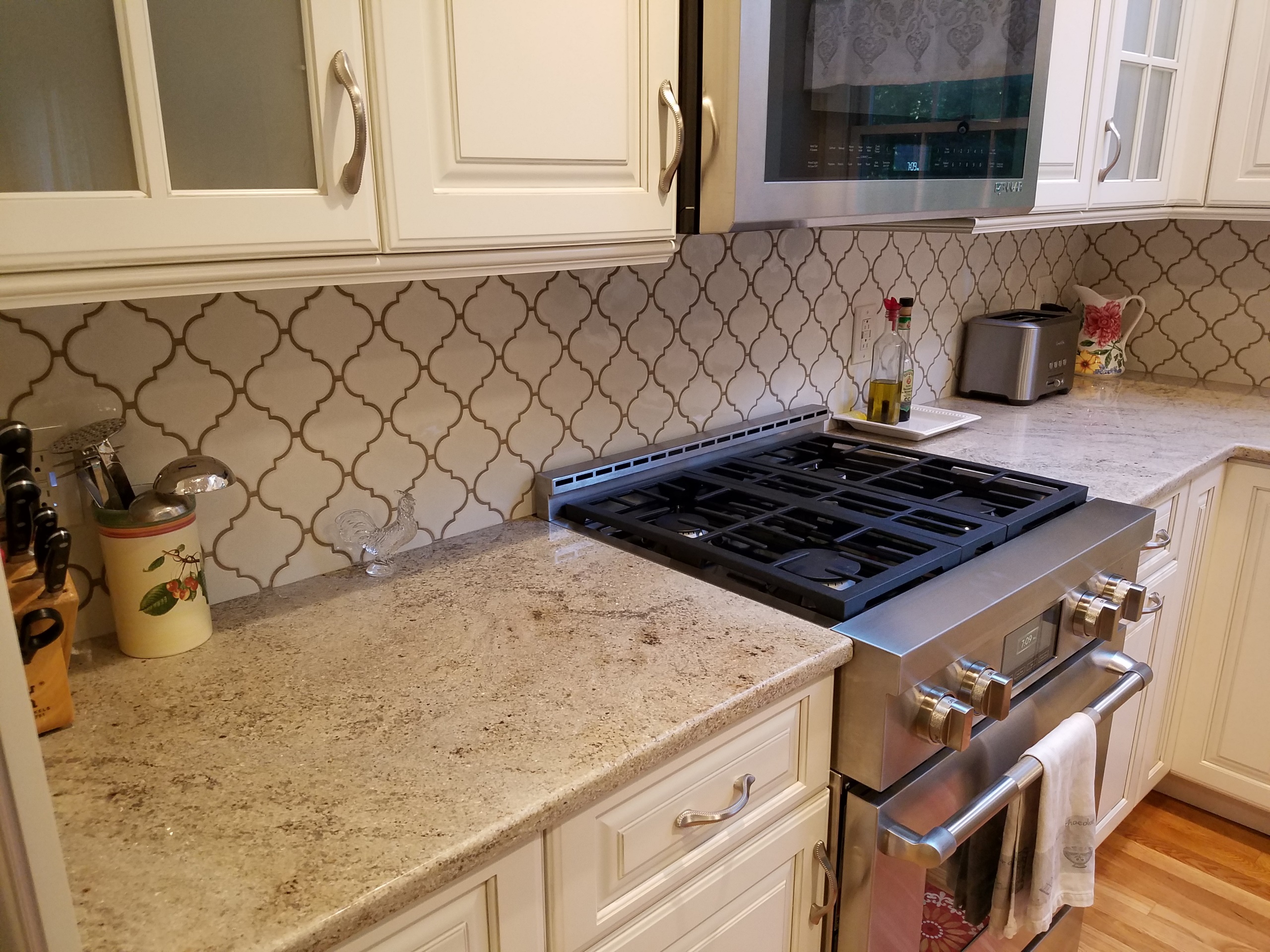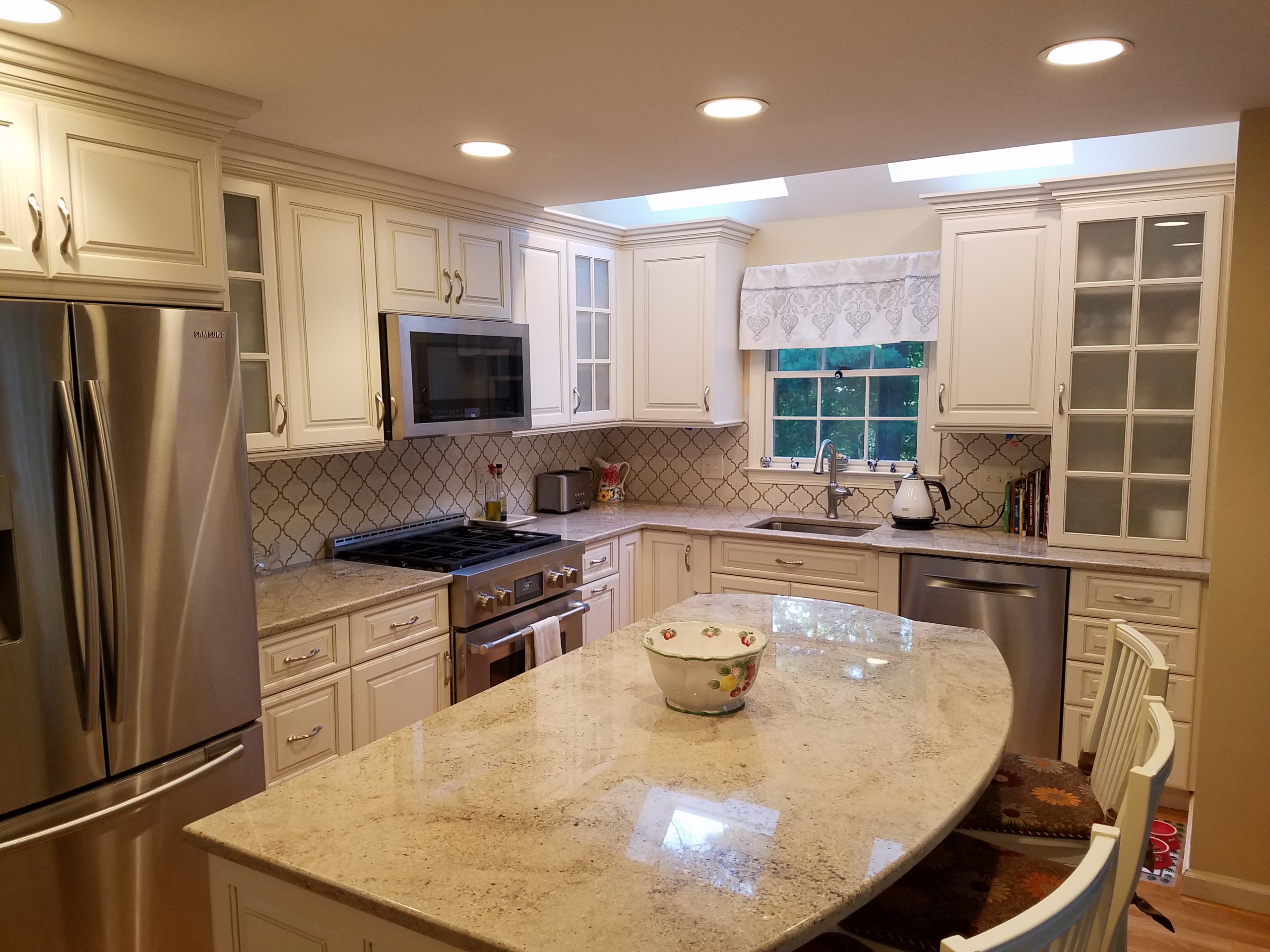 Kitchen / Kitchen / By Kon New custom kitchen cabinets and tile backsplash installation. Kitchen cabinets, backsplash and appliances installation.Custom designed kitchen.Unusual choice for tile backsplash.Granit counter tops and ceramic tiles.Kitchen island with sitting area.
